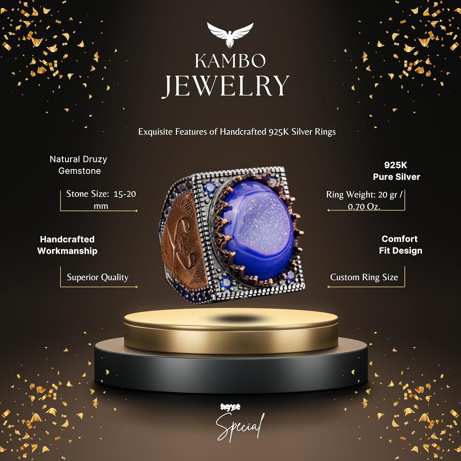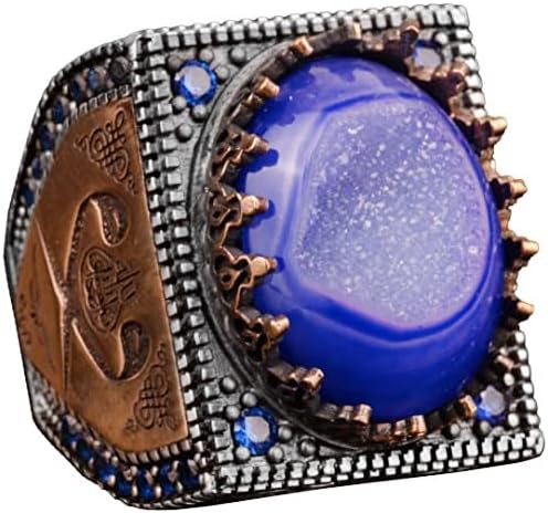 Gerçek Doğal Mavi Druzy Kuvars Taşı Erkek Yüzük, Erkekler İçin Doğum Taşı Yüzüğü, 925 Ayar Gümüş Yüzük