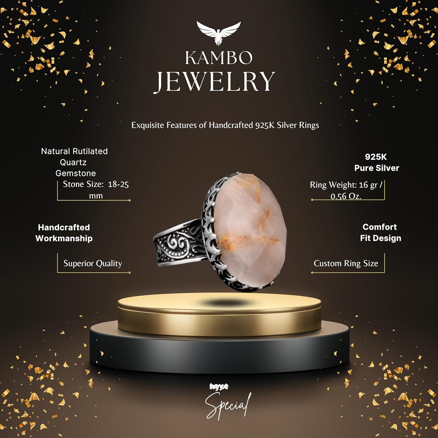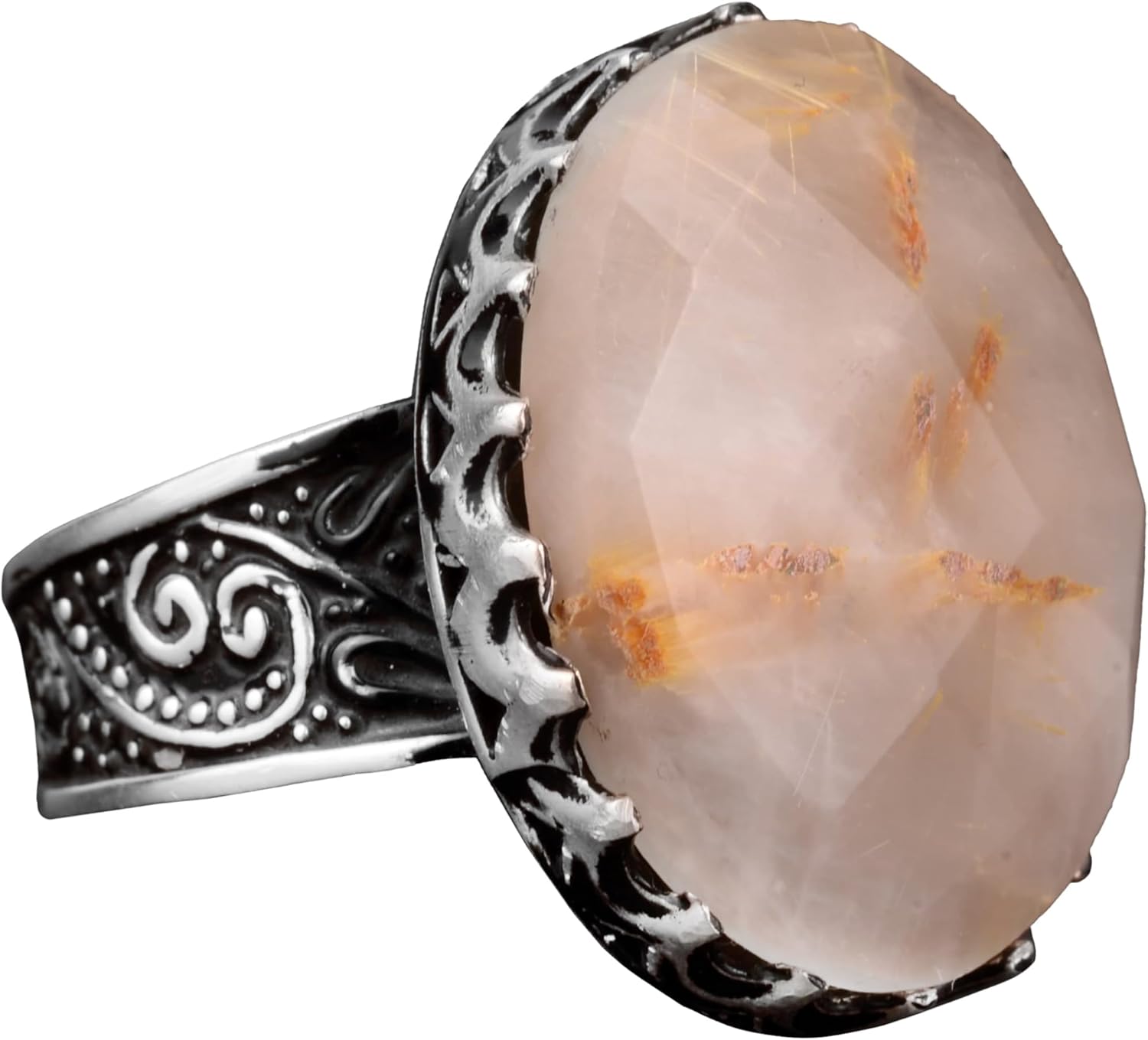 Gerçek Doğal Rutilit Kuvars Taşlı Yüzük, Büyük Yüzük, Erkek Yüzüğü, Gümüş Yüzük Erkekler İçin