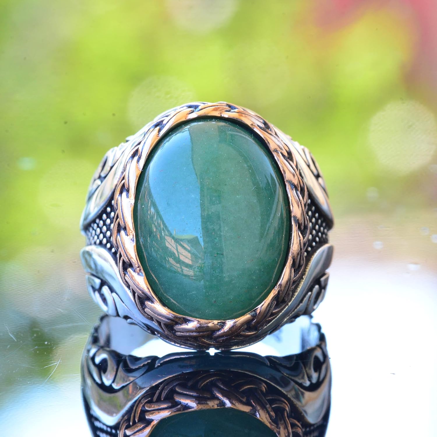 Gerçek Doğal Taş Yüzük, El Yapımı Yüzük, Yeşil Aventurin Oval Yüzük, 925 Ayar Gümüş Yüzük Erkekler İçin