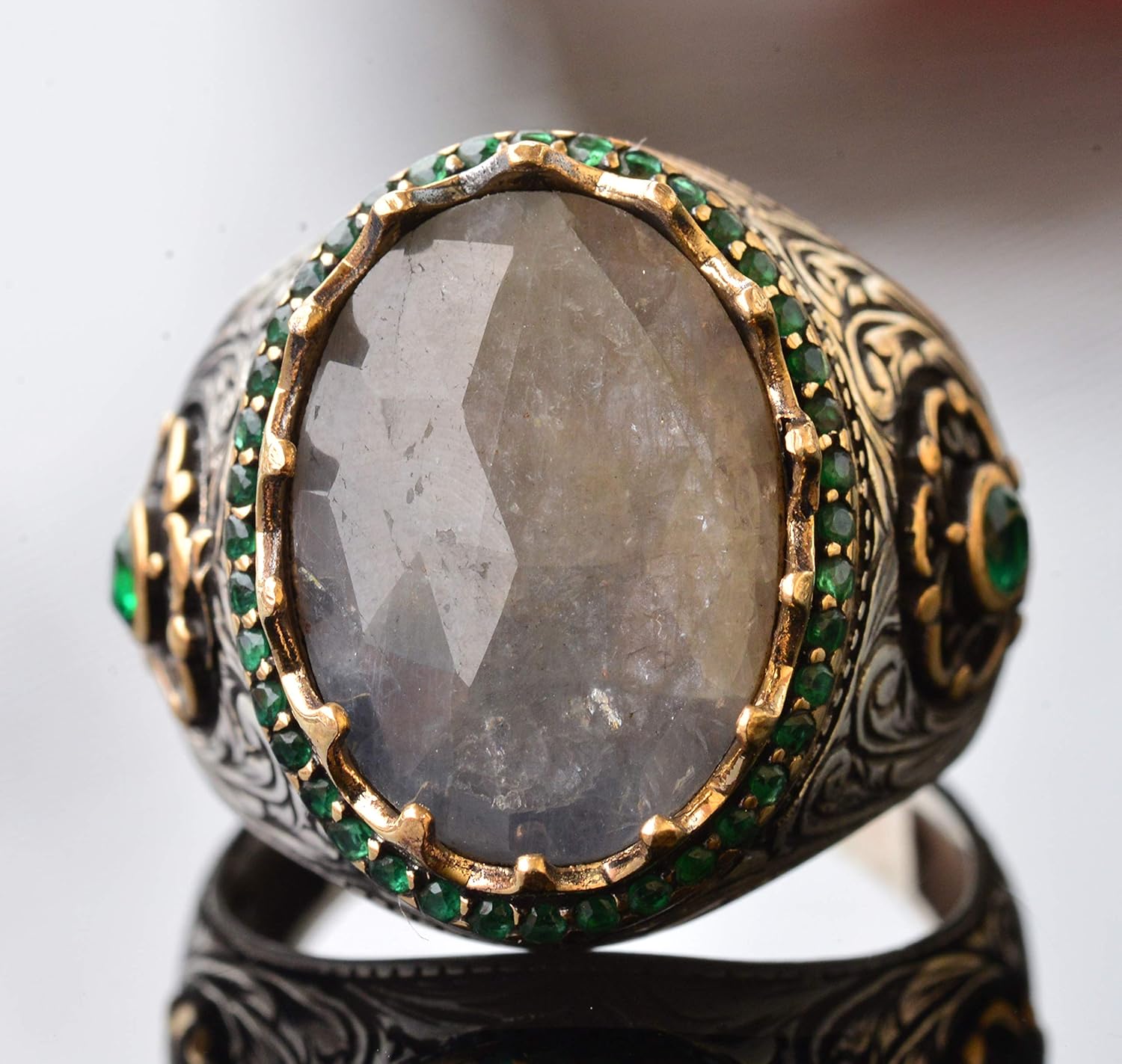 Gerçek Doğal Şeffaf Zümrüt Taşlı Erkek Yüzük, Vintage Yüzük, 925 Ayar Gümüş Yüzük