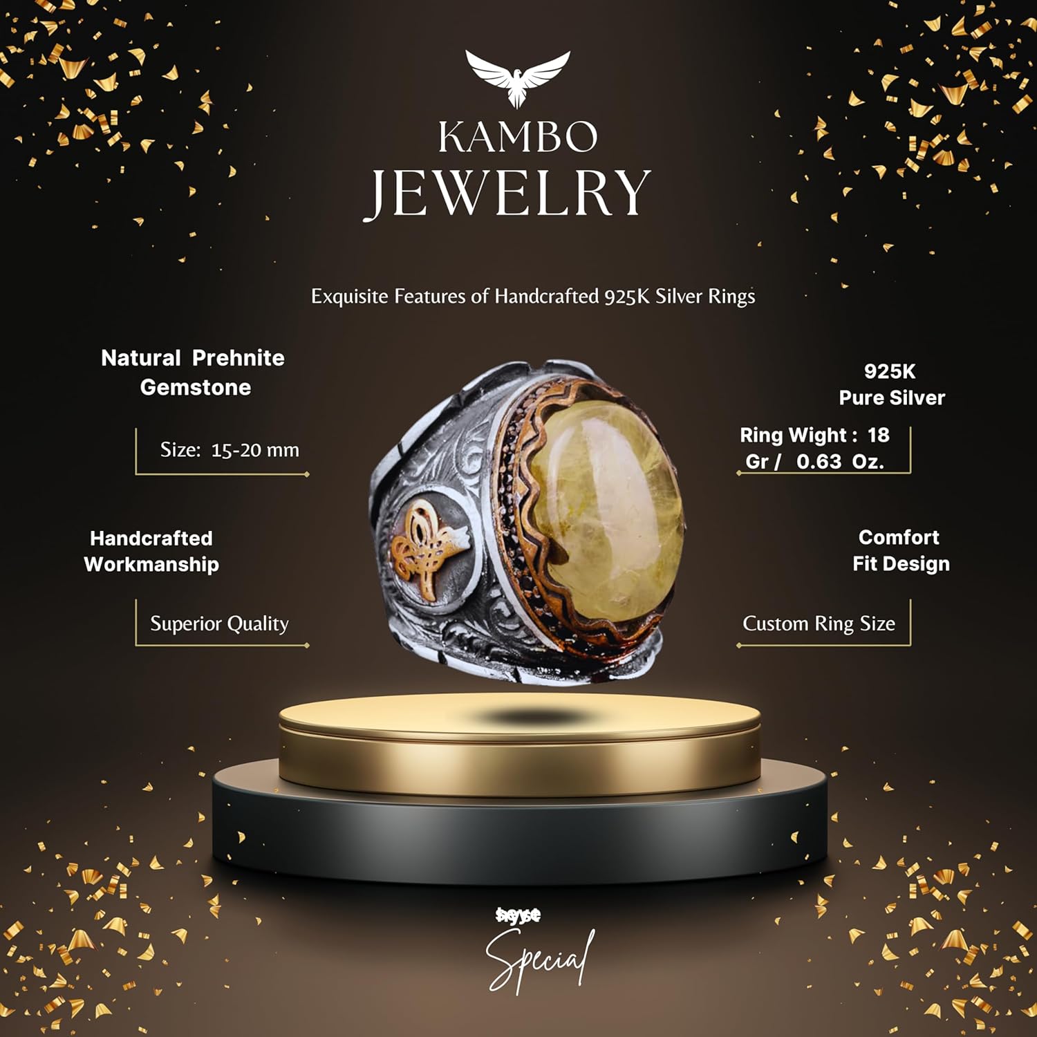 Gerçek Doğal Prehnite Taş Yüzük, 925 Ayar Gümüş Erkek Yüzük, Tugra Yüzük