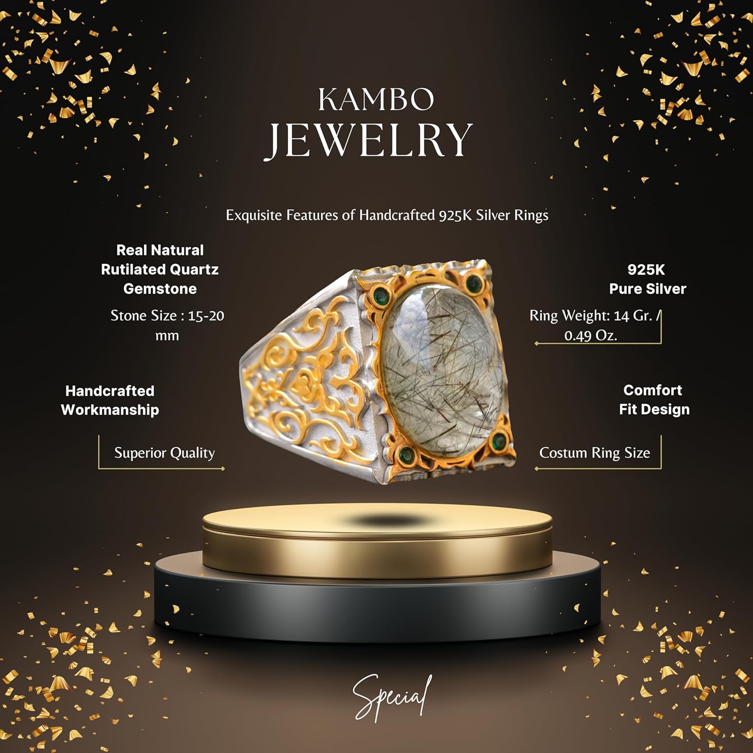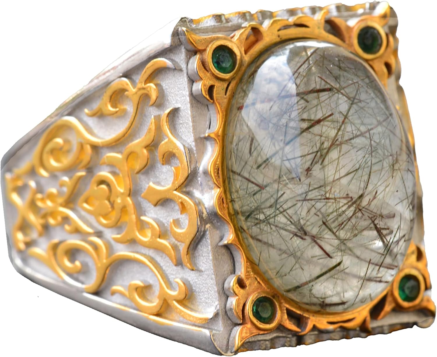 Gerçek Doğal Rutil Kuvars Taşı Erkek Yüzük, 925 Ayar Gümüş Yüzük, Altın Rutil Yüzük