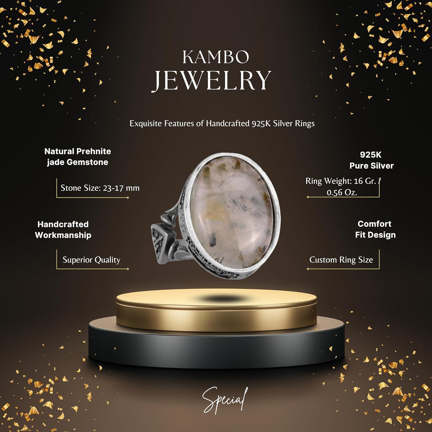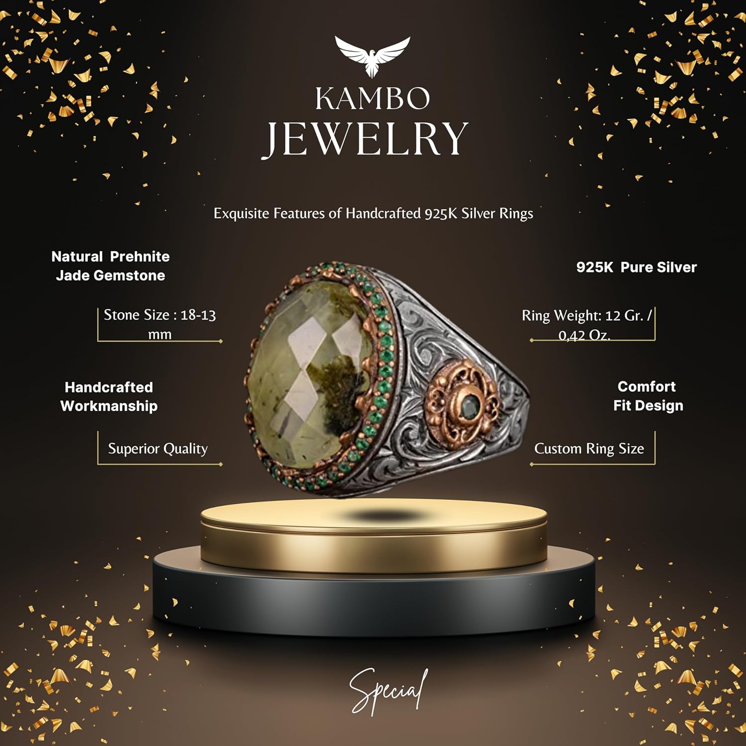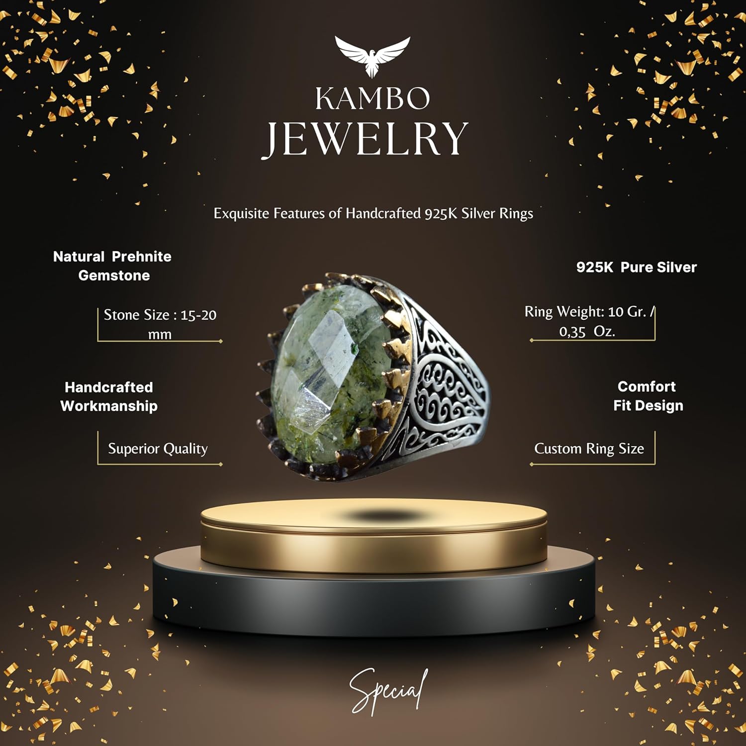 Gerçek Doğal Prehnit Taş Yüzük, 925 Ayar Gümüş Erkek Yüzüğü, El Yapımı Tasarım