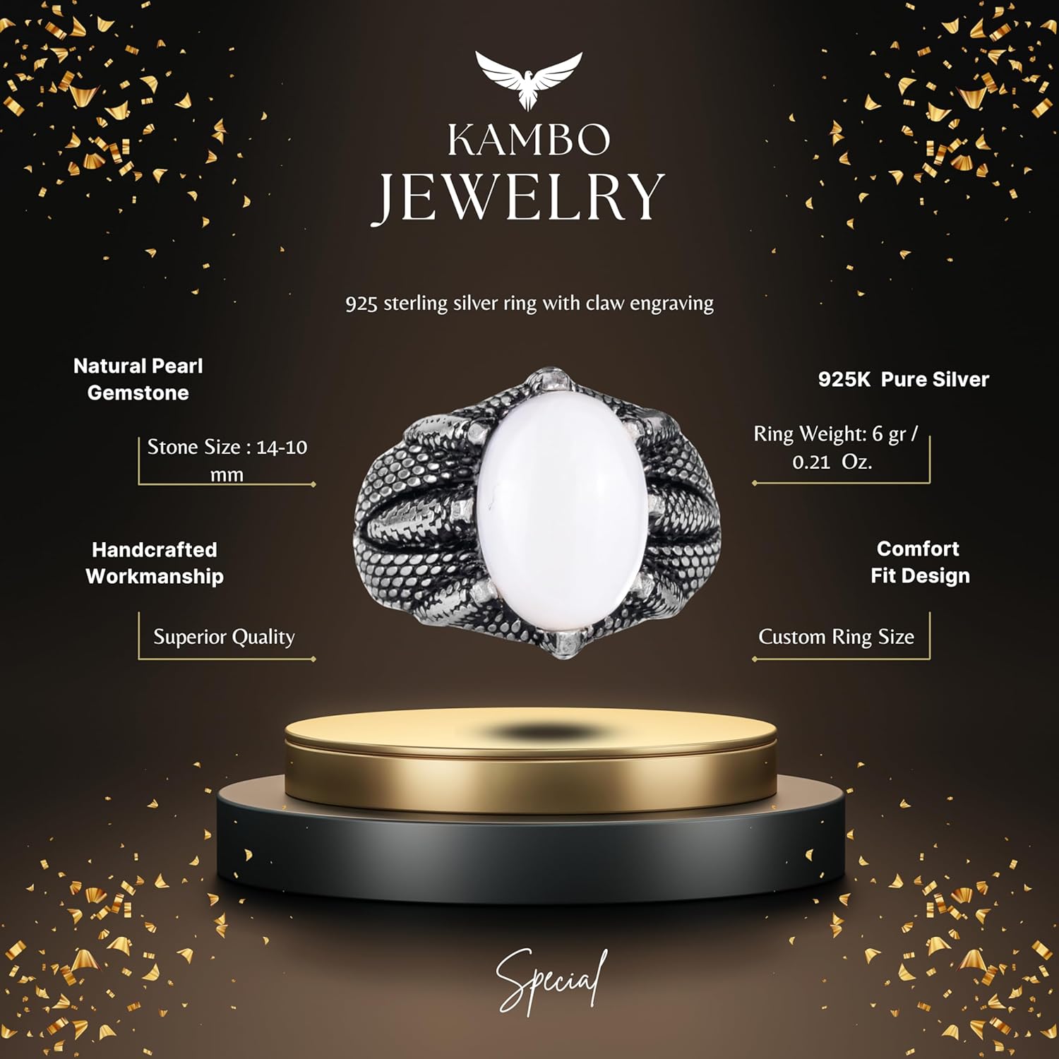 Gerçek Doğal Sedef Taş Yüzük - El Yapımı Kartal Yüzüğü - 925 Ayar Gümüş Yüzük