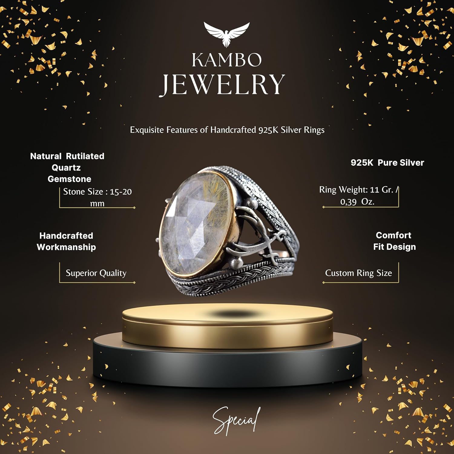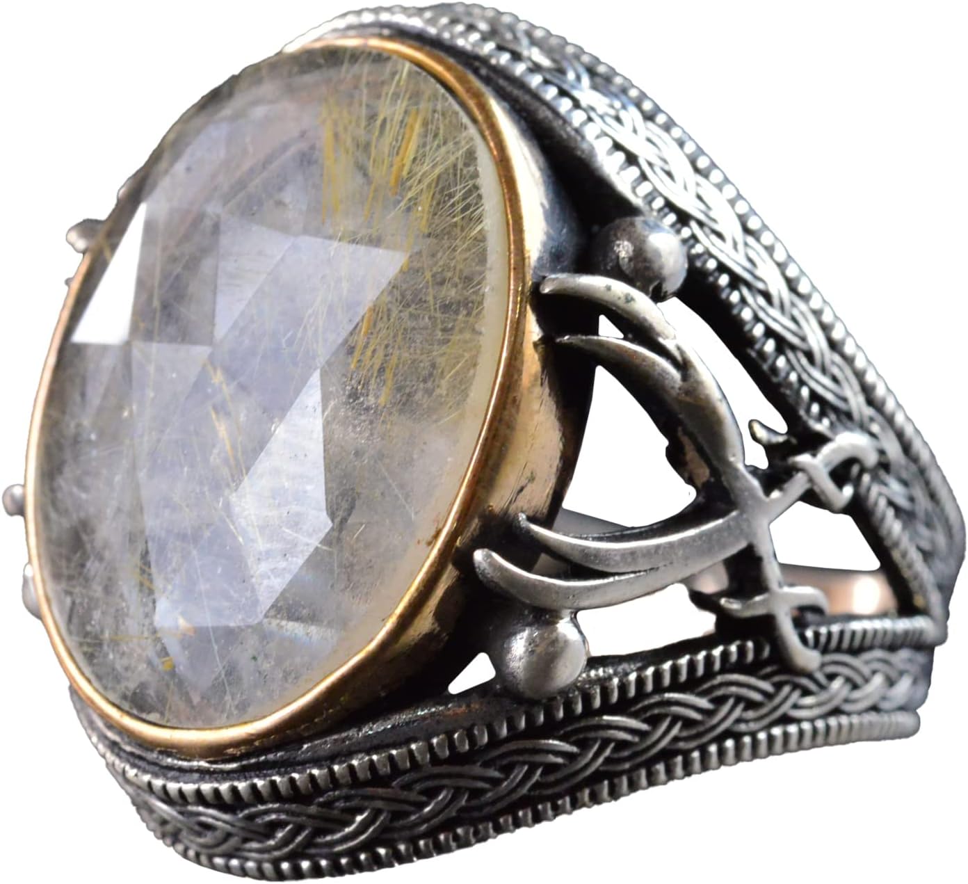 Gerçek Doğal Taş Erkek Yüzüğü, Kılıç Yüzüğü, 925 Ayar Gümüş Erkek Yüzüğü (Rutilatlı Kuvars)