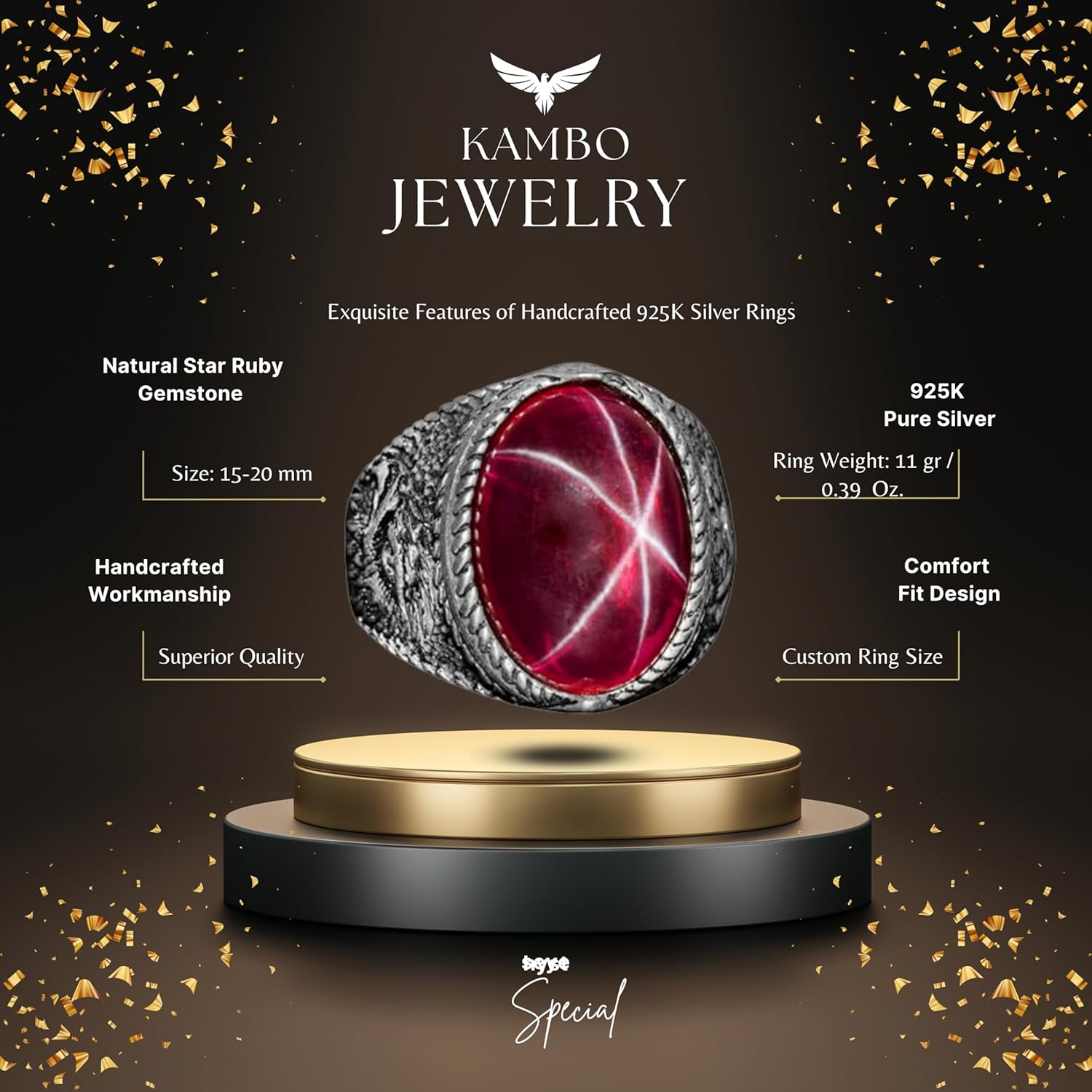 Gerçek Doğal Taş Erkek Yüzüğü, Şahin Yüzüğü, 925 Ayar Gümüş Yüzük (Yıldız Yakutu)