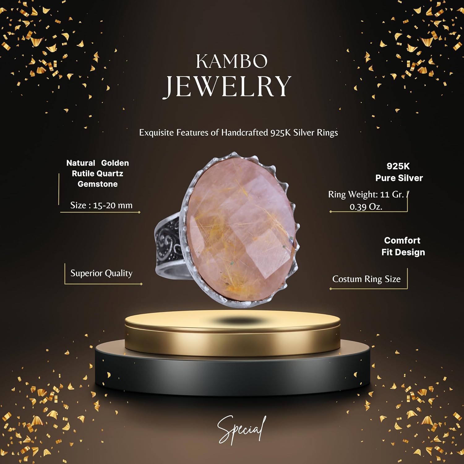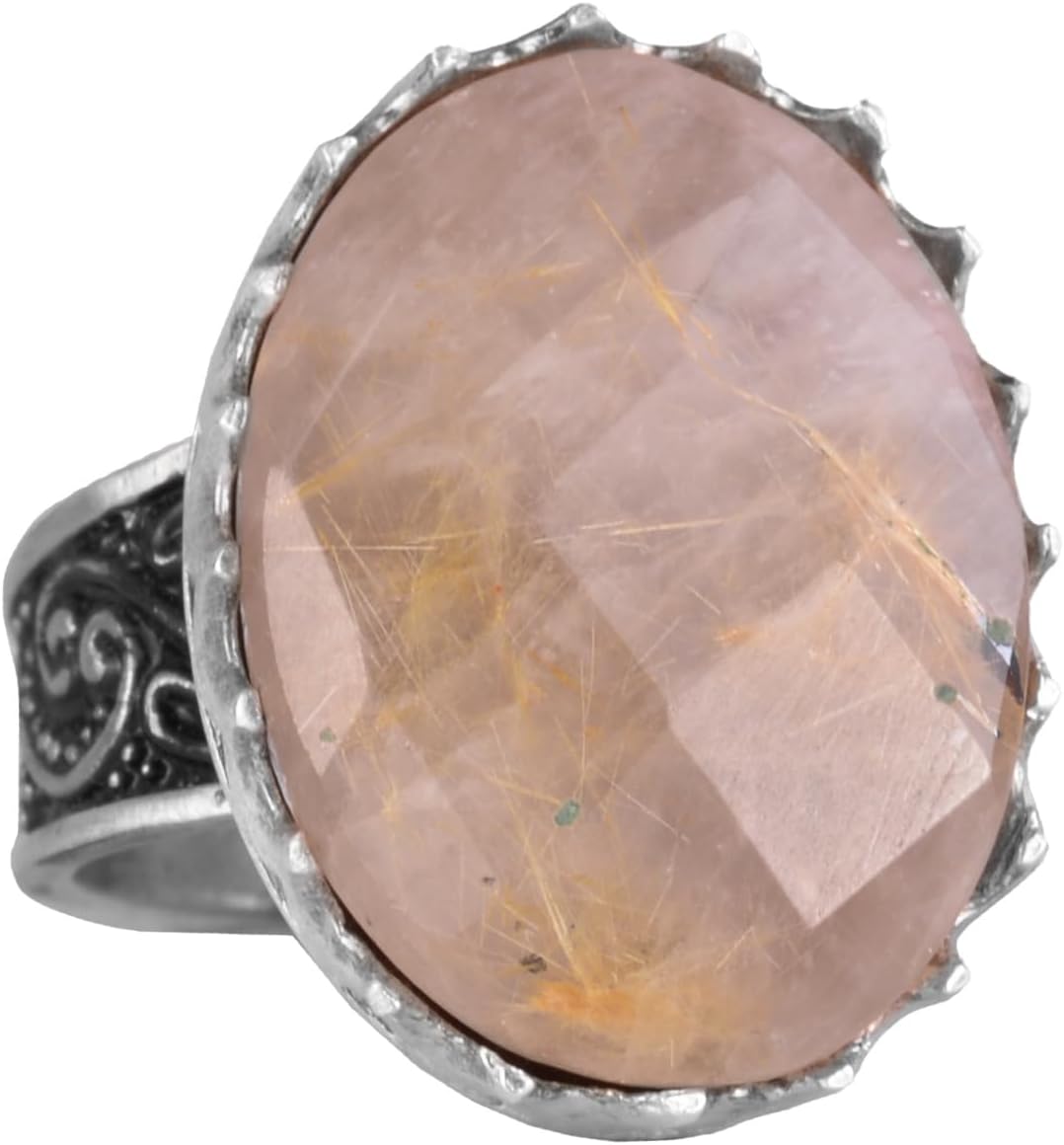 Gerçek Doğal Taş Yüzük - 925 Ayar Gümüş Büyük Yüzük - El Yapımı Yüzük (Altın rutilet kuvars)