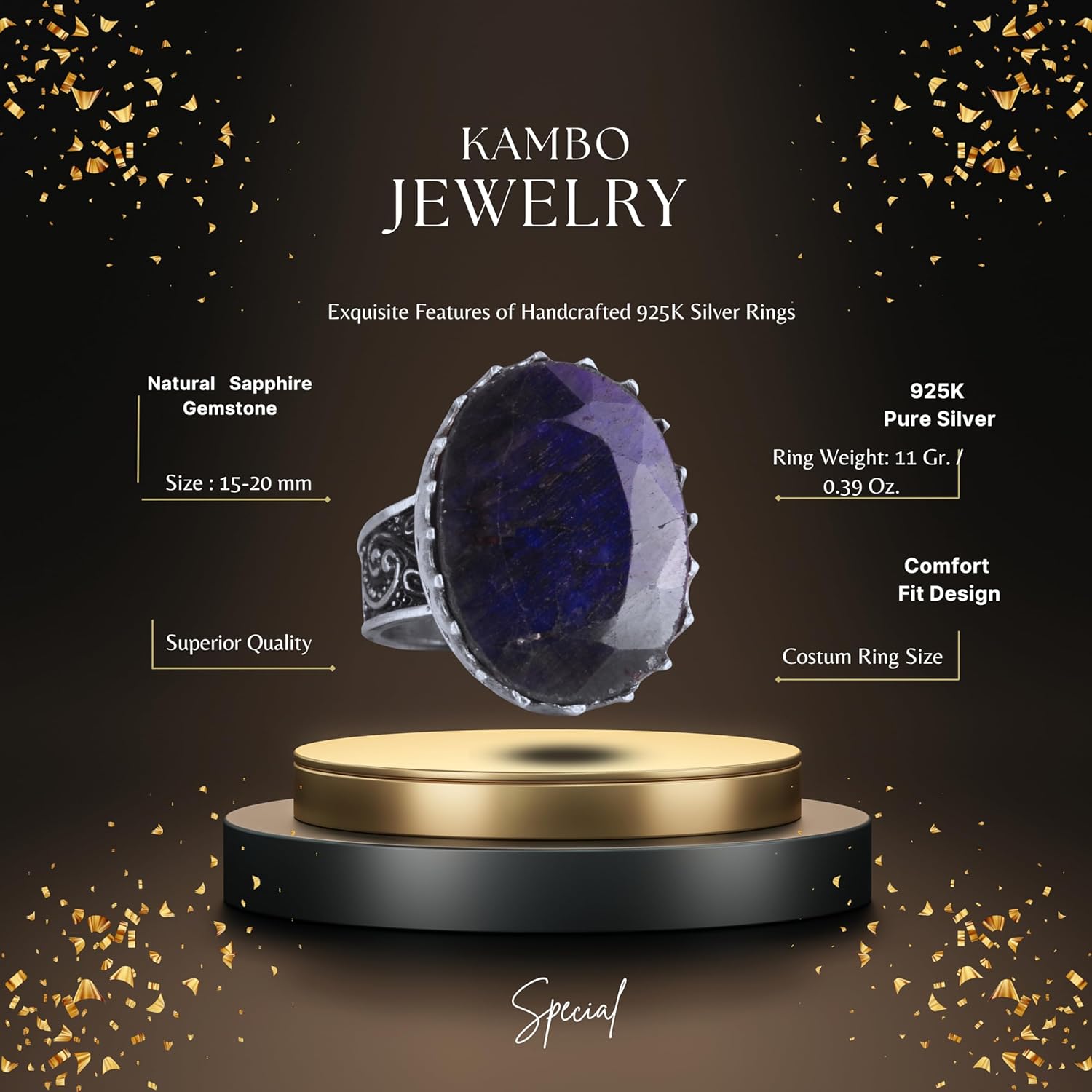 Gerçek Doğal Taş Yüzük - 925 Ayar Gümüş Büyük Yüzük - El Yapımı Yüzük (Mavi Safir)