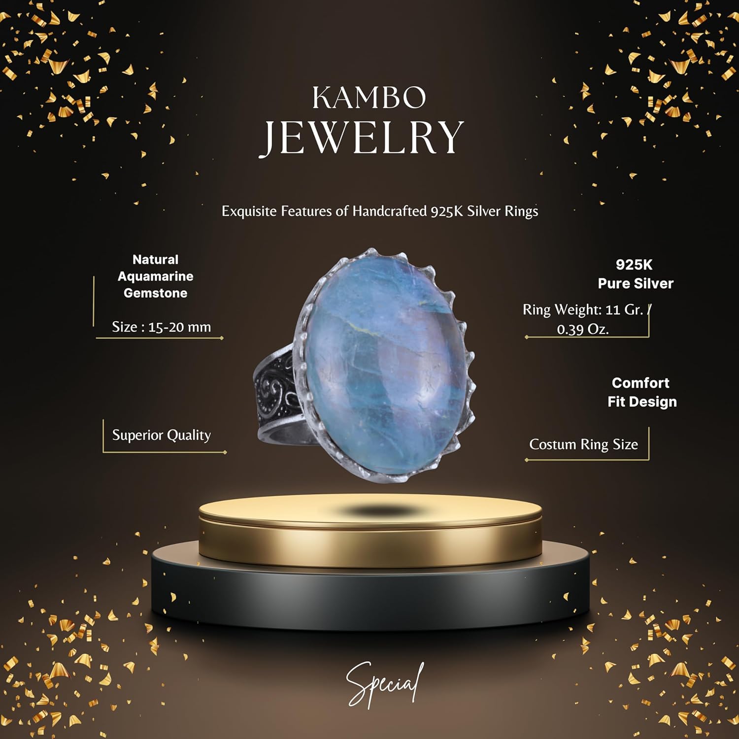 Gerçek Doğal Taş Yüzük - 925 Ayar Gümüş Büyük Yüzük - El Yapımı Yüzük (Aquamarine)