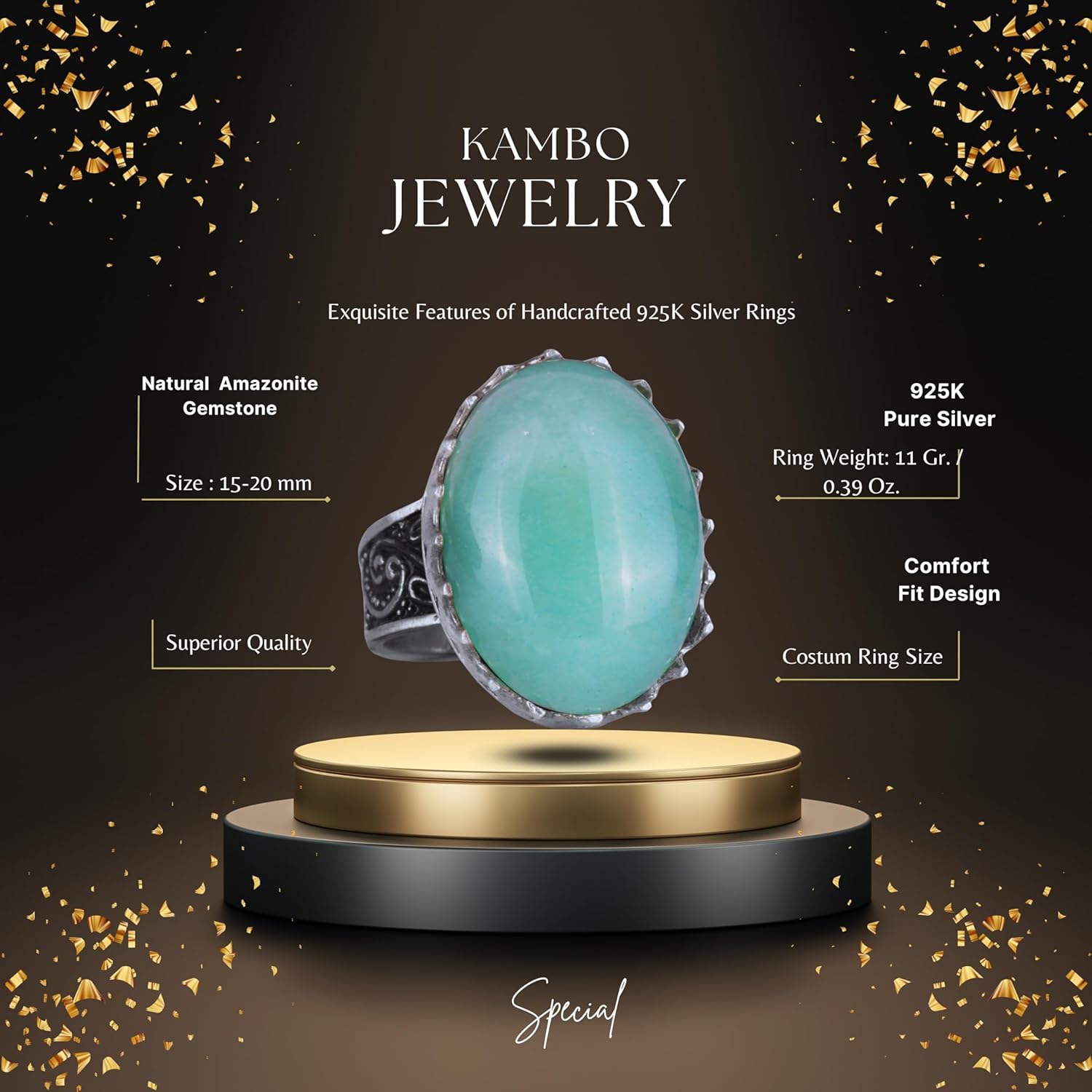 Gerçek Doğal Taş Yüzük - 925 Ayar Gümüş Büyük Yüzük - El Yapımı Yüzük (Amazonit)