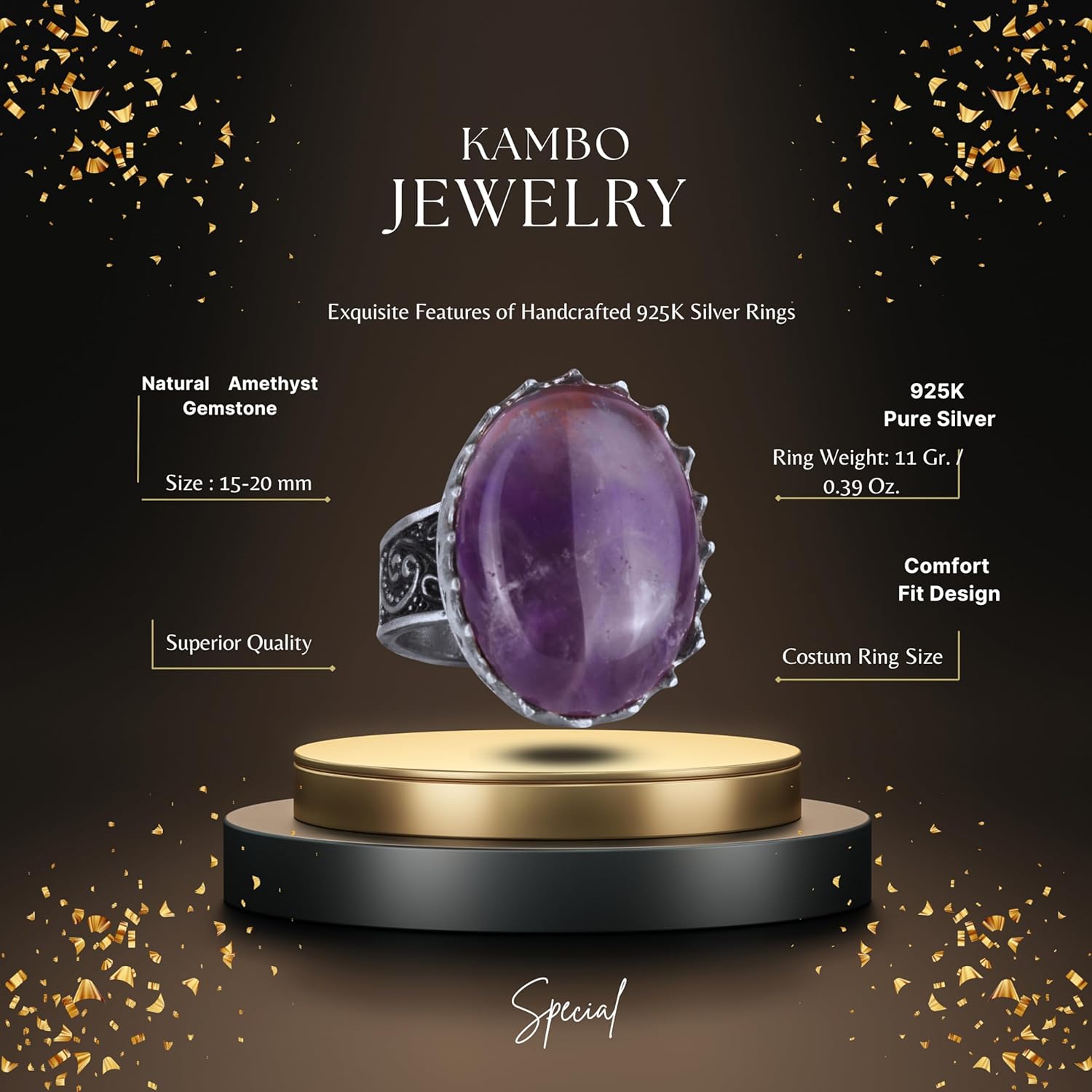 Gerçek Doğal Taş Yüzük - 925 Ayar Gümüş Büyük Yüzük - El Yapımı Yüzük (Ametist)