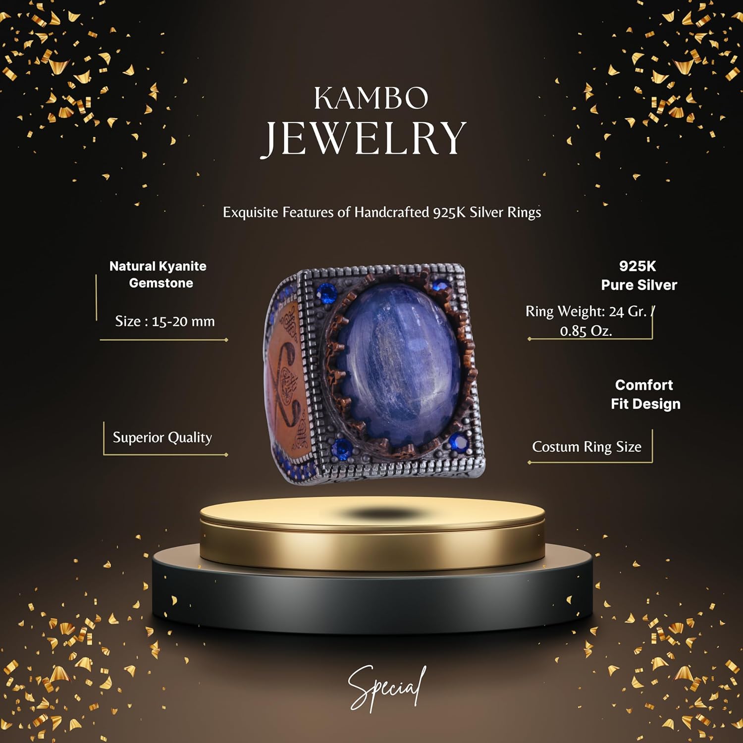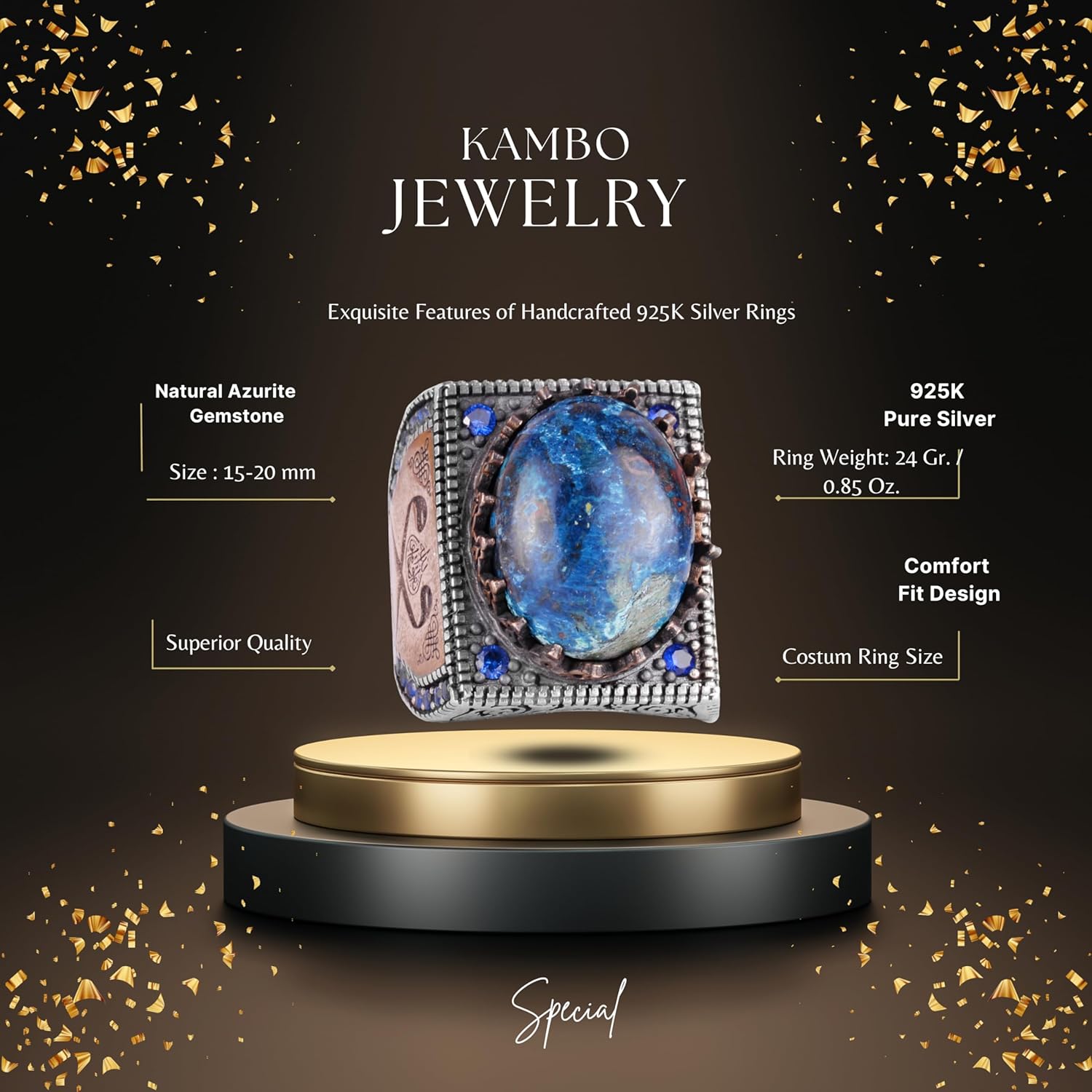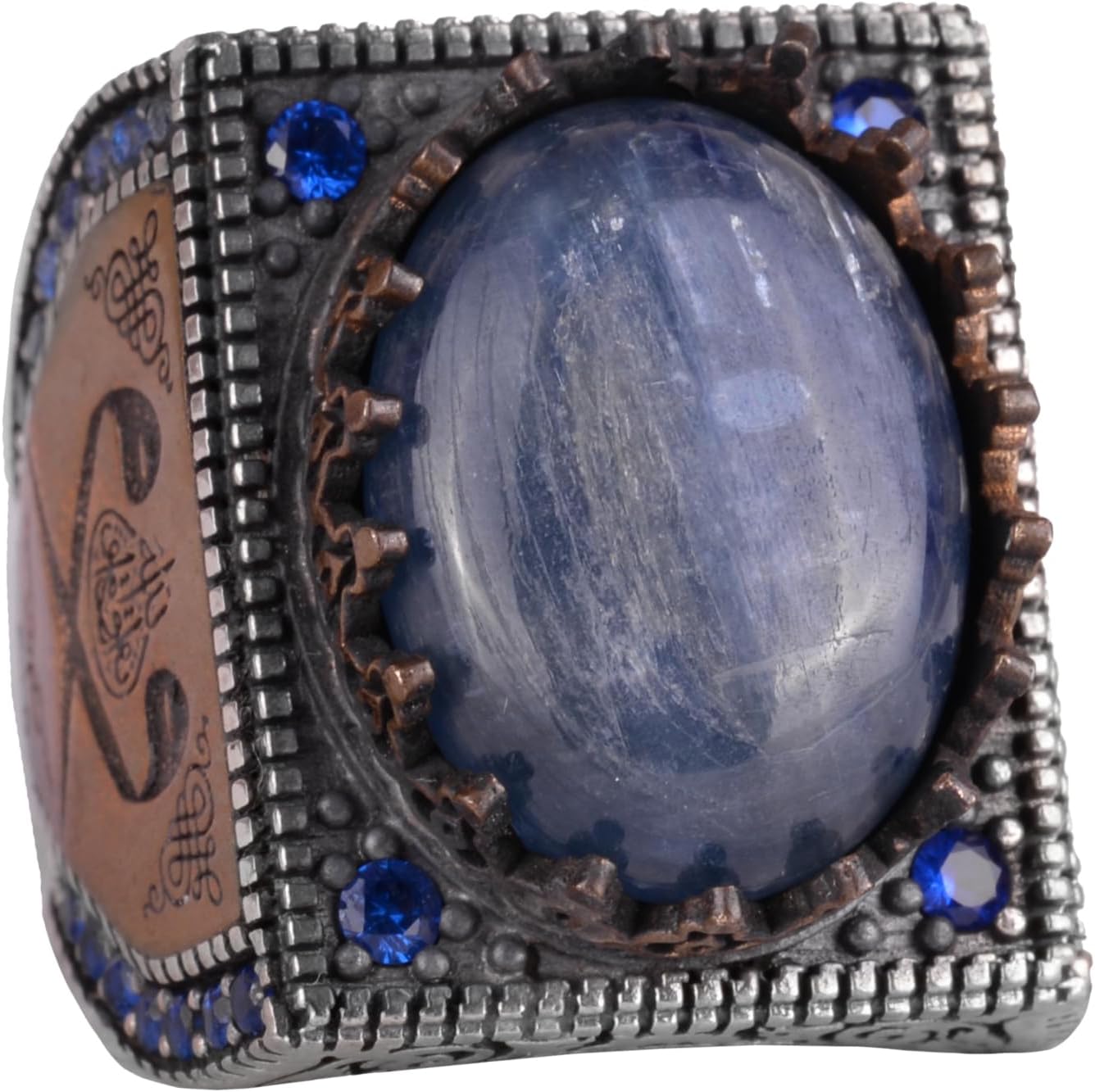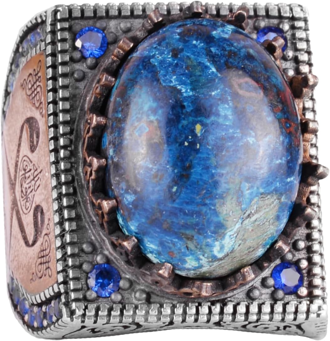 Gerçek Doğal Taş Yüzük - 925 Ayar Gümüş İslami Yüzük - El Yapımı Hat Yazılı Yüzük (Azurit)