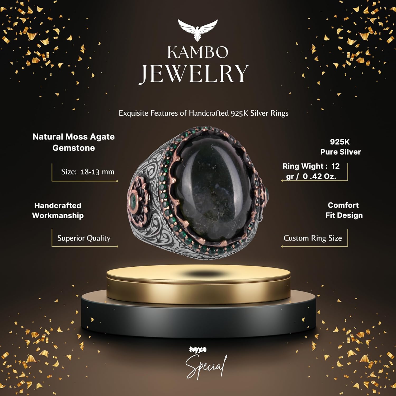 Gerçek Doğal Taş Yüzük - 925 Ayar Gümüş El Yapımı Yüzük (Yosun Agate)