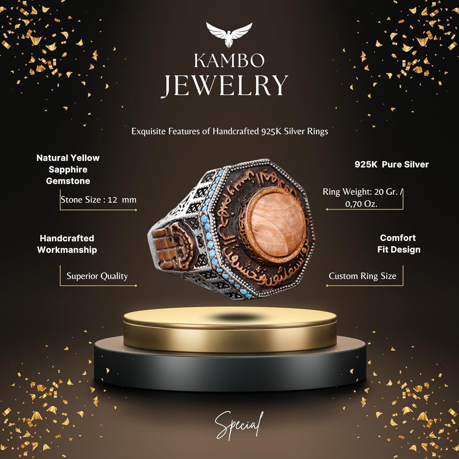 Gerçek Doğal Taş Yüzük - 925 Ayar Gümüş Erkek İslami Özel Yüzük Al-Aksa Camii Tasarımı (Sarı Safir)