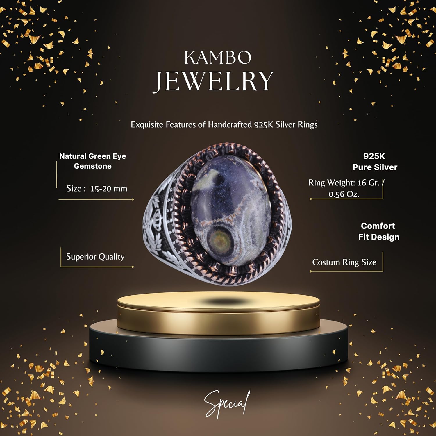 Gerçek Doğal Taş Yüzük - El Yapımı Kartal Yüzüğü - 925 Ayar Gümüş Yüzük (Yeşil Göz)
