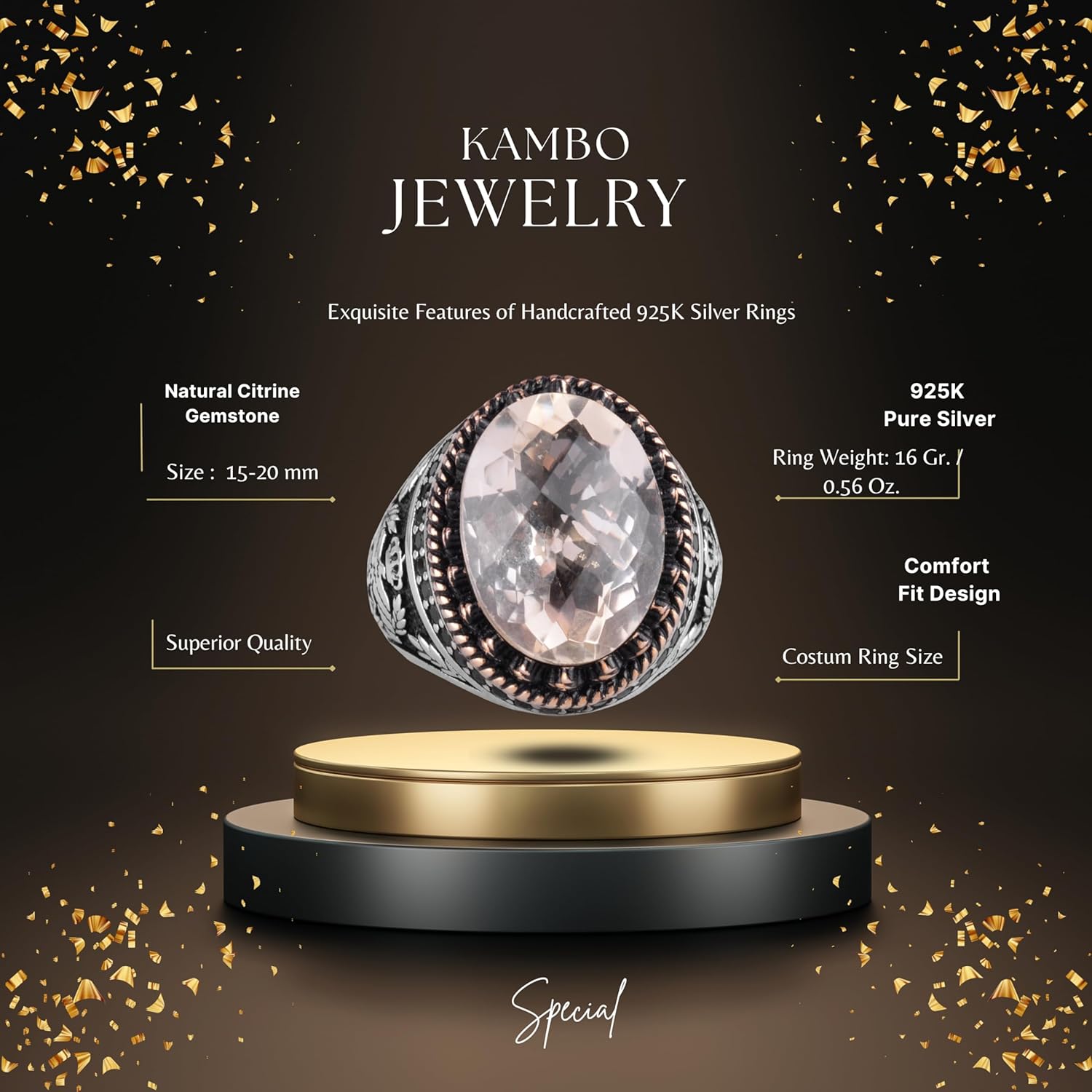 Gerçek Doğal Taş Yüzük - El Yapımı Kartal Yüzüğü - 925 Ayar Gümüş Yüzük (Sitrin)