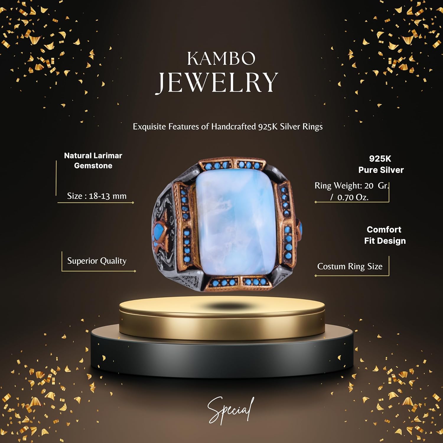 Gerçek Doğal Taş Yüzük - El Yapımı Yüzük - 925 Ayar Gümüş Yüzük (Larimar)