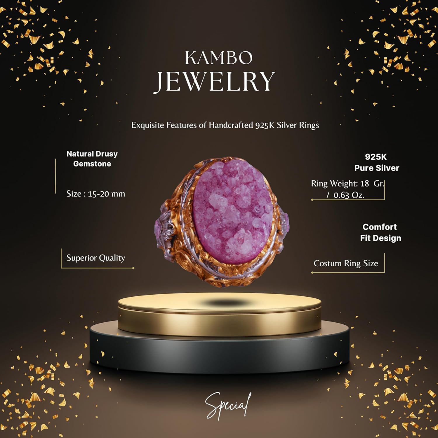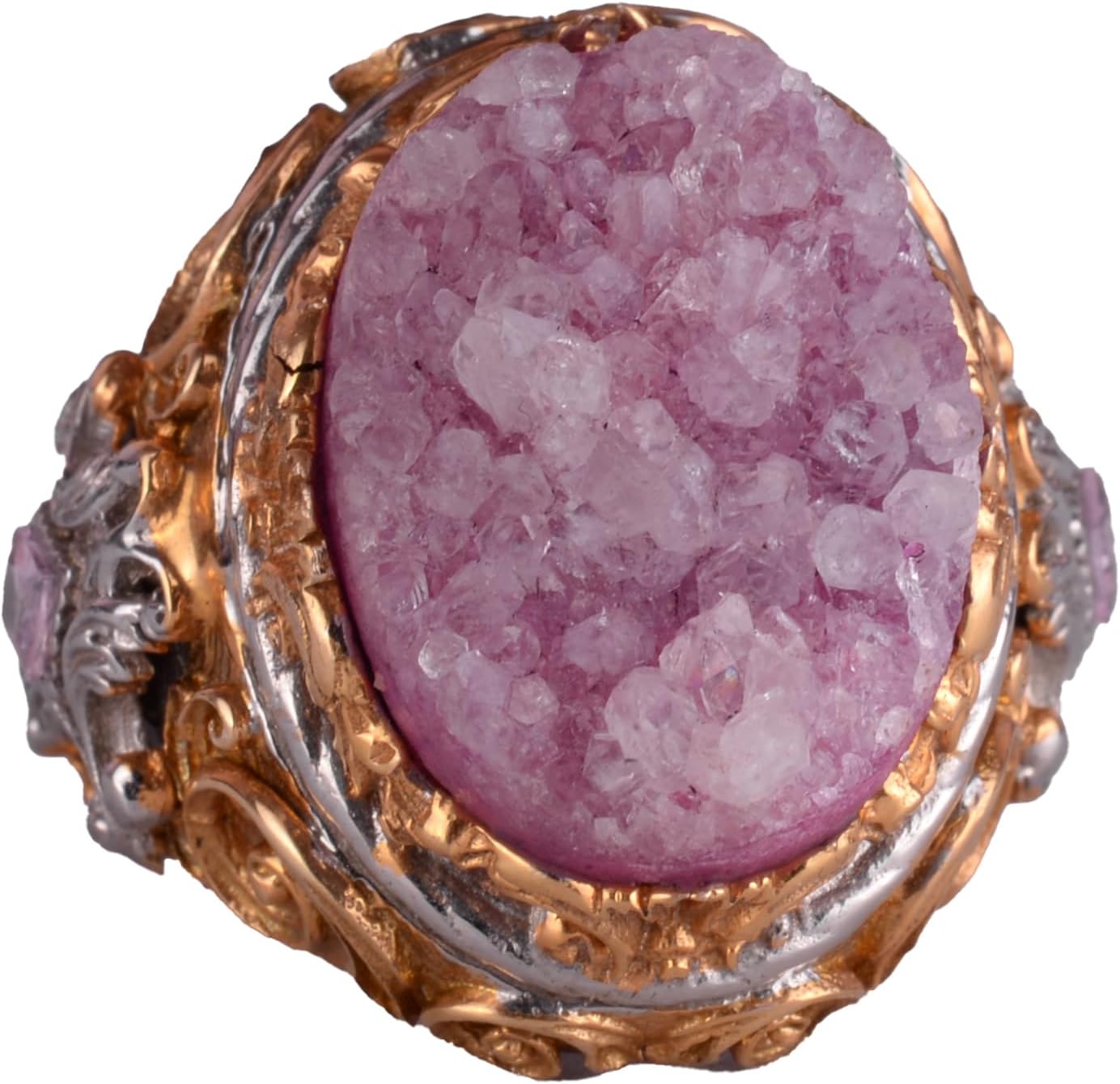 Gerçek Doğal Taş Yüzük - Erkekler için Sultan Yüzüğü - Altın Kaplama 925 Ayar Gümüş Yüzük - El Yapımı Yüzük (Drusy Kuvars)