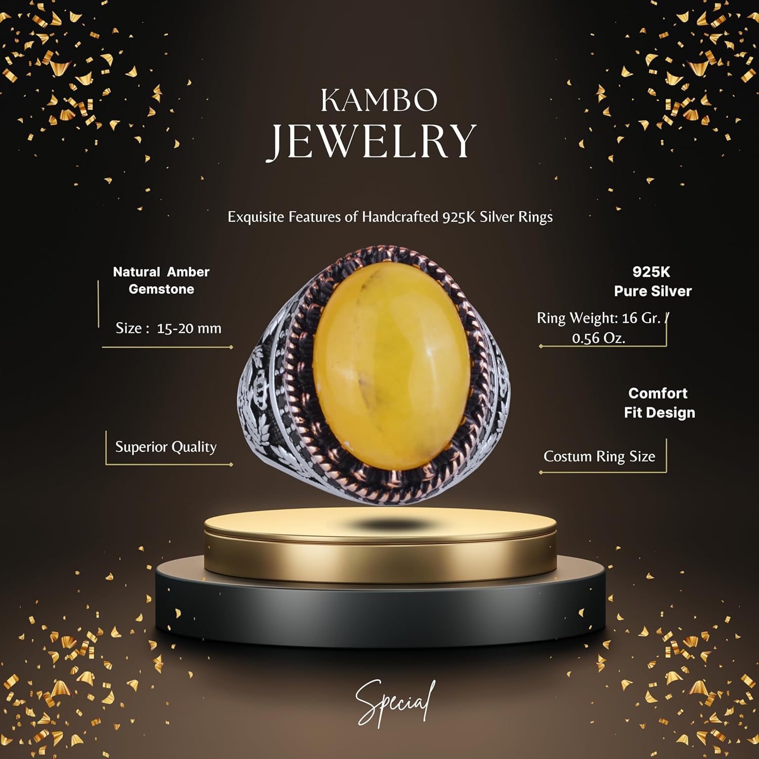 Gerçek Doğal Taş Yüzük - El Yapımı Şahin Yüzük - 925 Ayar Gümüş Yüzük (Amber)