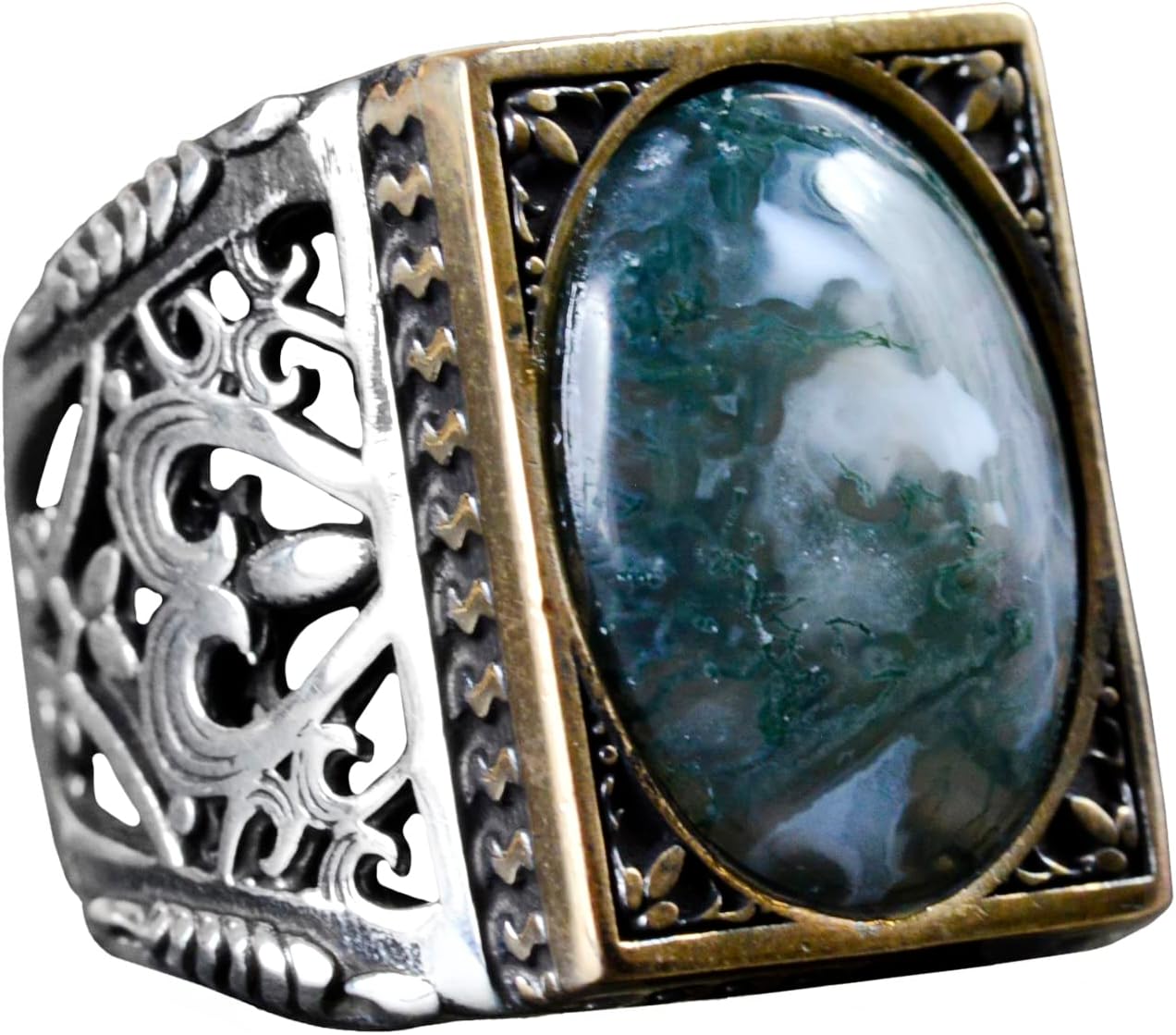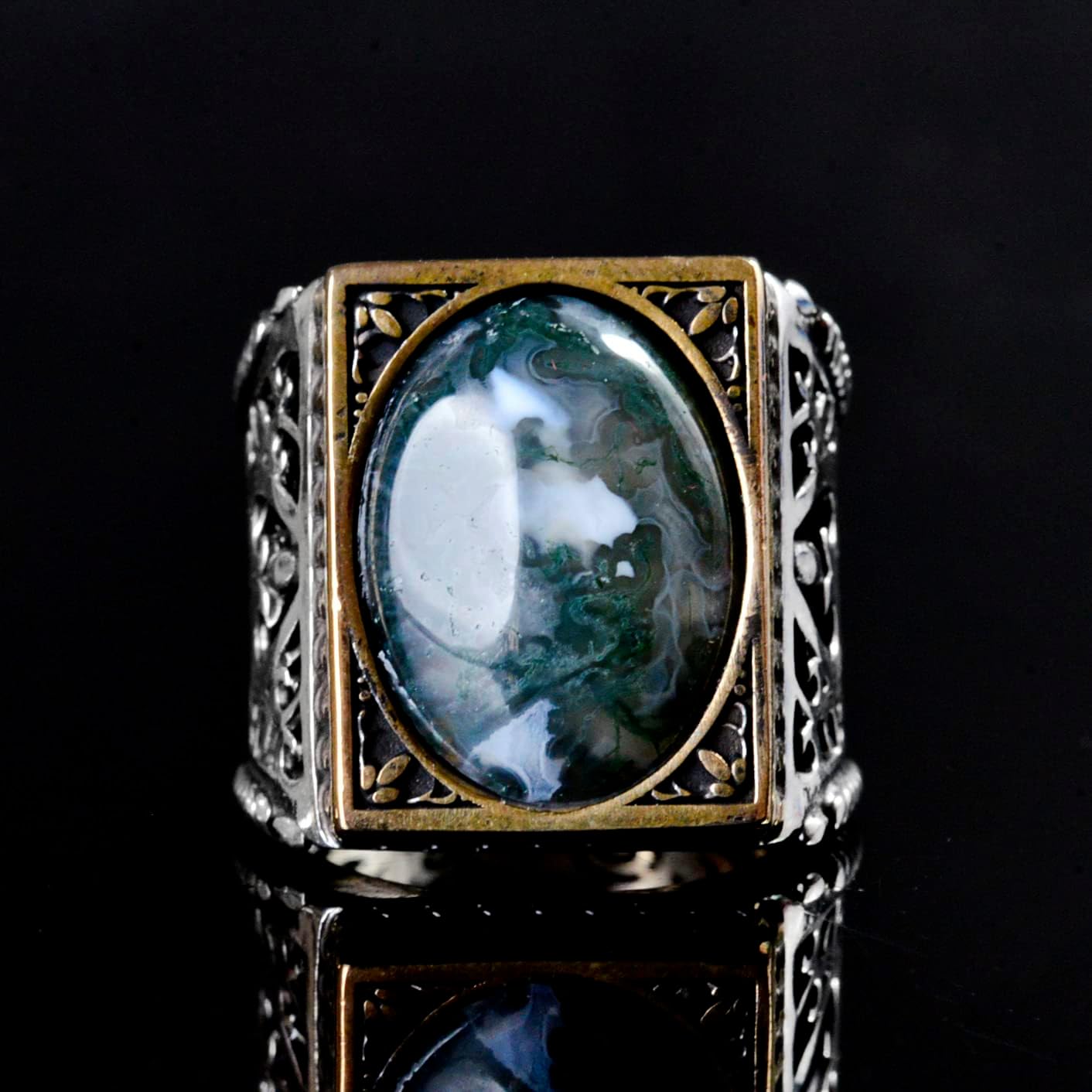Gerçek Doğal Taş Yüzük, 925 Ayar Gümüş Yüzük (Yosunlu Akik)