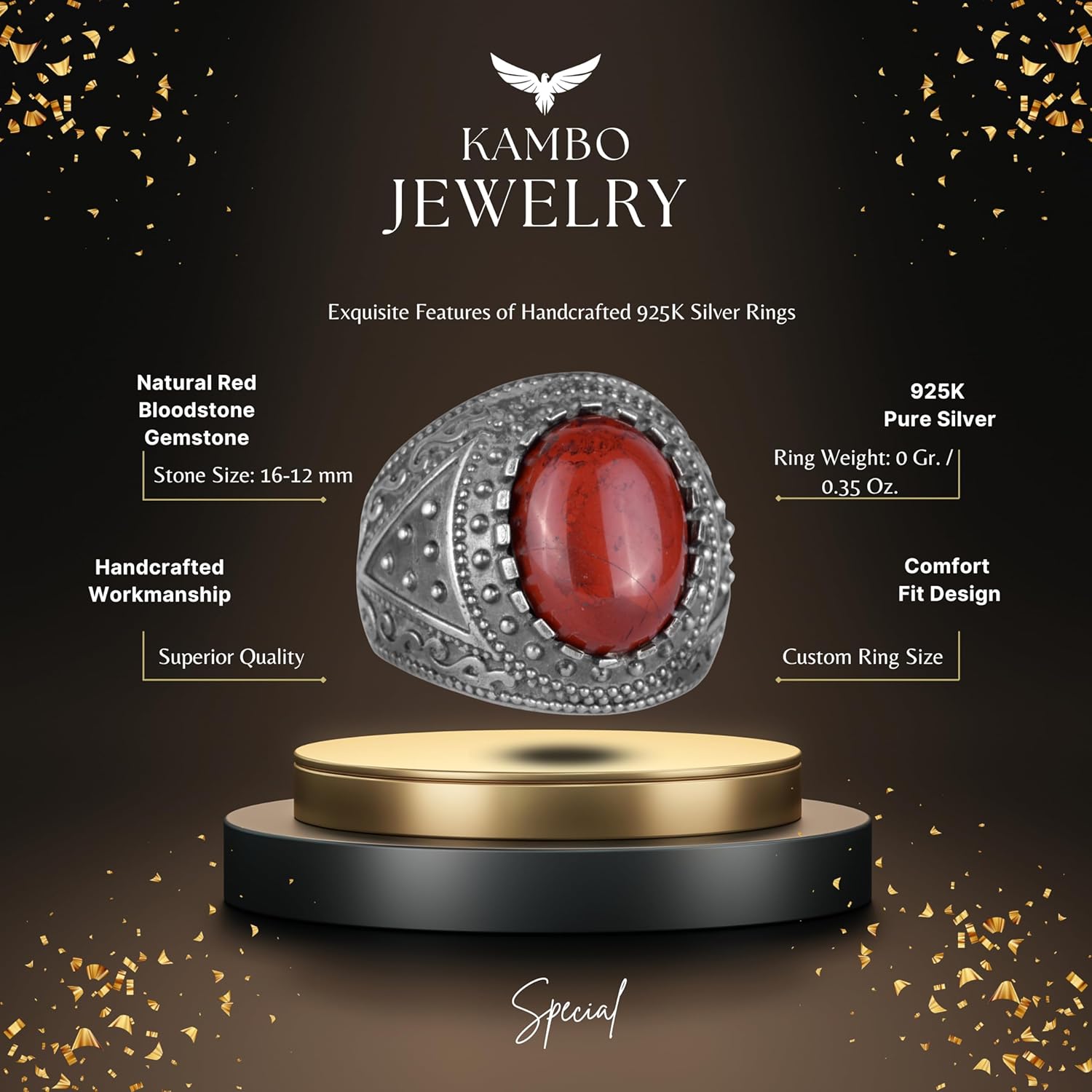 Gerçek Doğal Taş Yüzük, 925 Ayar Katı Gümüş Erkek Yüzüğü (Kırmızı Kan Taşı)