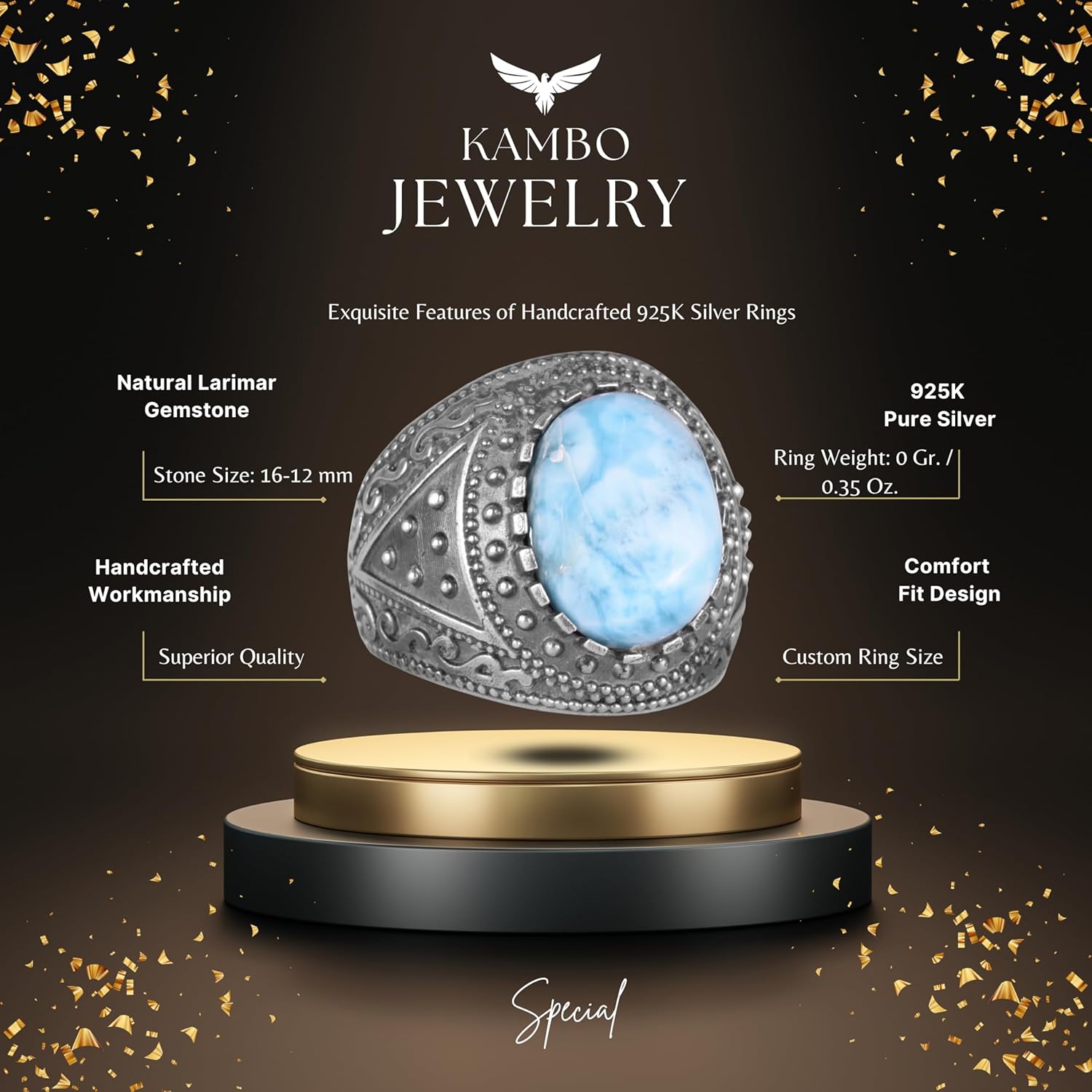 Gerçek Doğal Taş Yüzük, 925 Ayar Katı Gümüş Erkek Yüzüğü (Larimar)