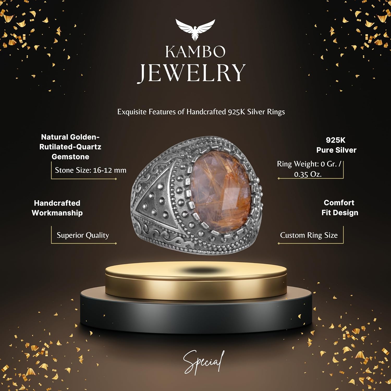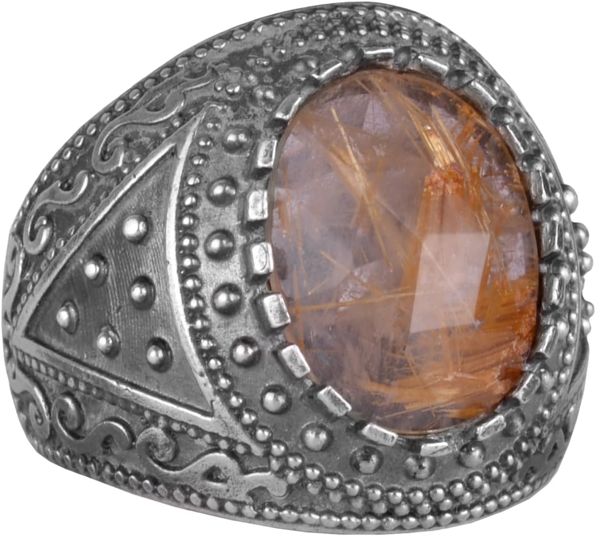 Gerçek Doğal Taş Yüzük, 925K Katı Gümüş Erkek Yüzüğü (Rutilatlı Kuvars)