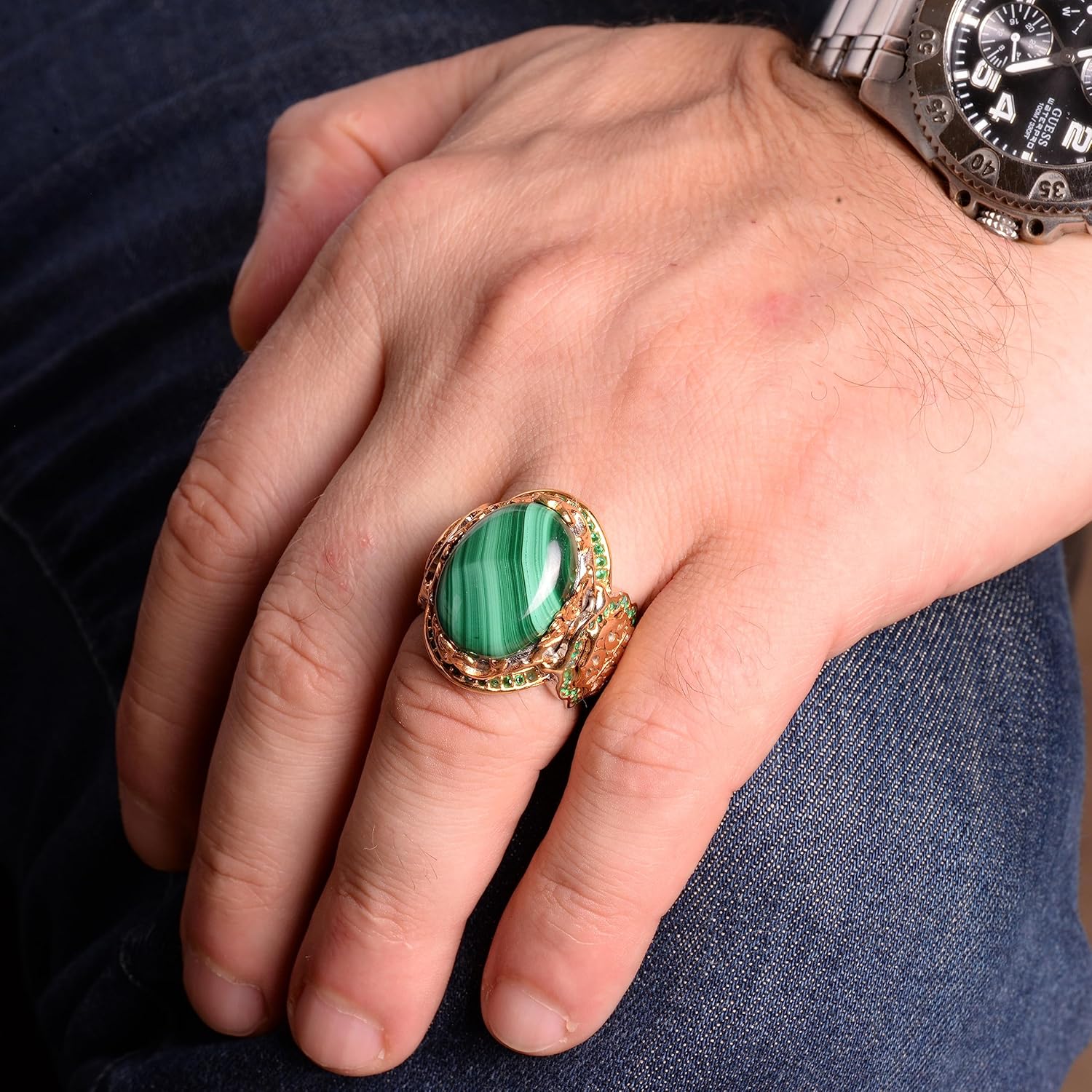 Gerçek Doğal Taş Yüzük, 925 Ayar Sert Gümüş Erkek Yüzüğü (Yeşil Göz)