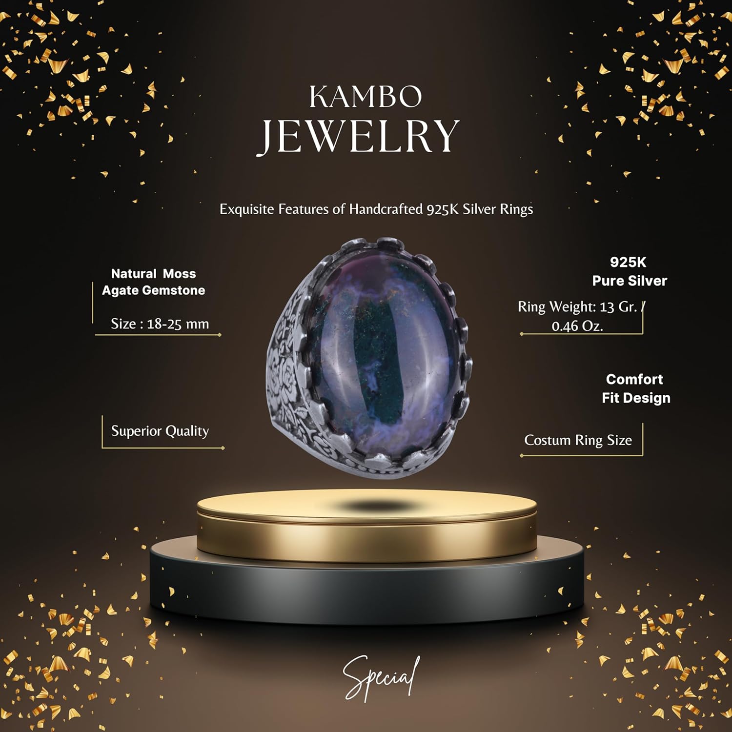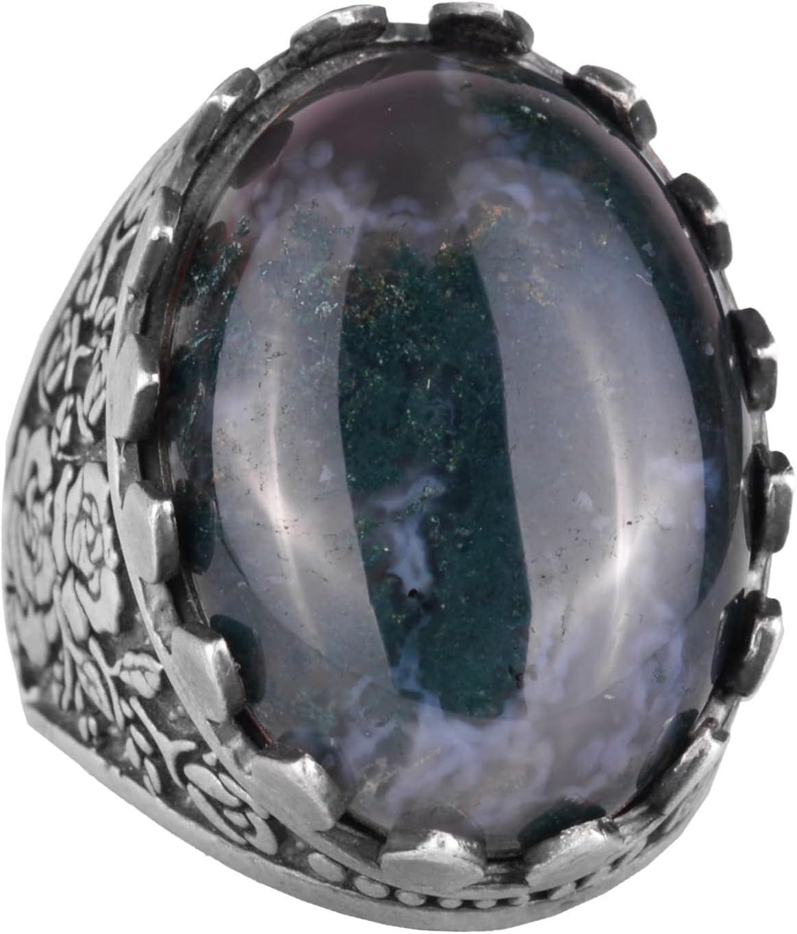 Gerçek Doğal Yosunlu Akik Taş Yüzük - Gül Desenli Yüzük - 925 Ayar Gümüş Yüzük - El Yapımı Büyük Yüzük