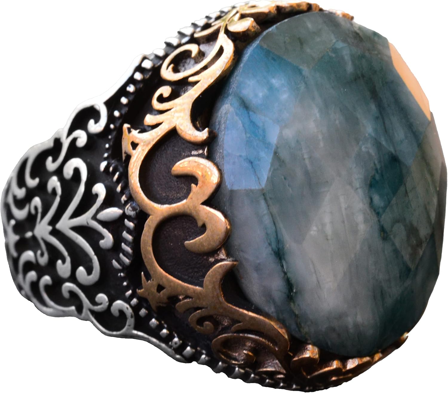 Gerçek Doğal Zümrüt Taşı Erkek Yüzük, Osmanlı Yüzüğü, Orta Doğu Etnik Tasarım, 925 Ayar Gümüş Yüzük