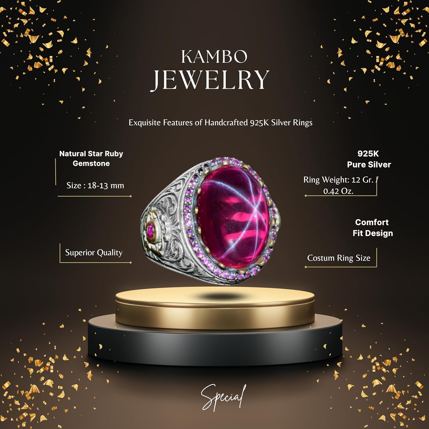 Gerçek Doğal Yıldız Yakutu Taşlı Yüzük, El Yapımı Yüzük, Sultan Yüzüğü, 925 Ayar Gümüş Yüzük