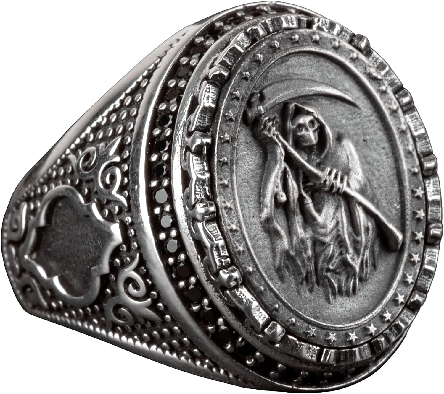 Kafatası Yüzük ile Azrail Tasarımı - 925 Ayar Gümüş Yüzük - El Yapımı Gotik Takı