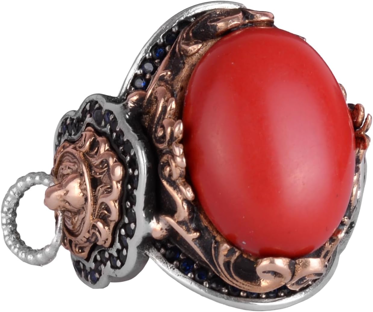 Kırmızı Mercan Taşı Yüzük, 925 Ayar Gümüş Erkek Yüzüğü, Aslan Sembolü Yüzüğü, Hayvan Gümüş Yüzüğü