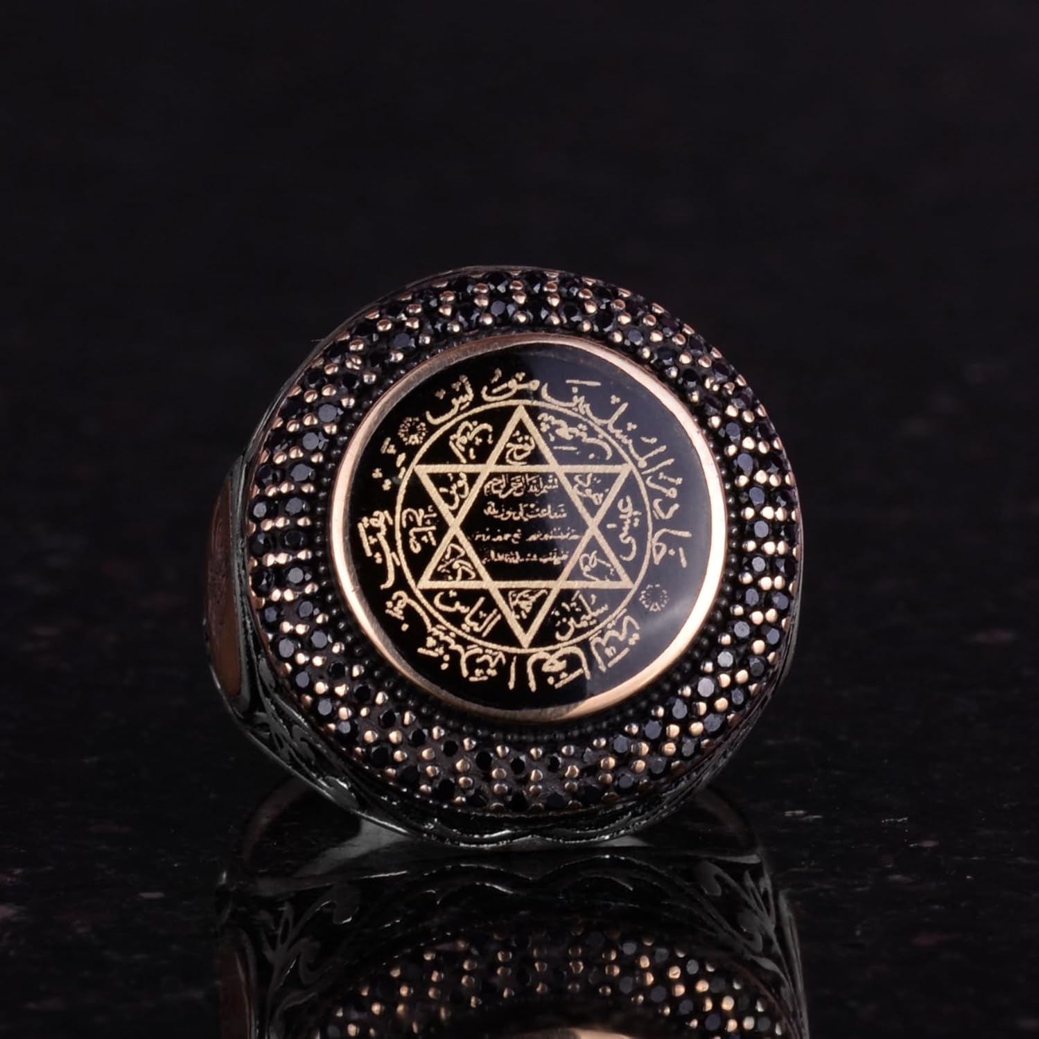 Kral Süleyman Mührü Oniks Taş Yüzük - Beyaz 925 Ayar Gümüş Erkek Davut Yıldızı Takı
