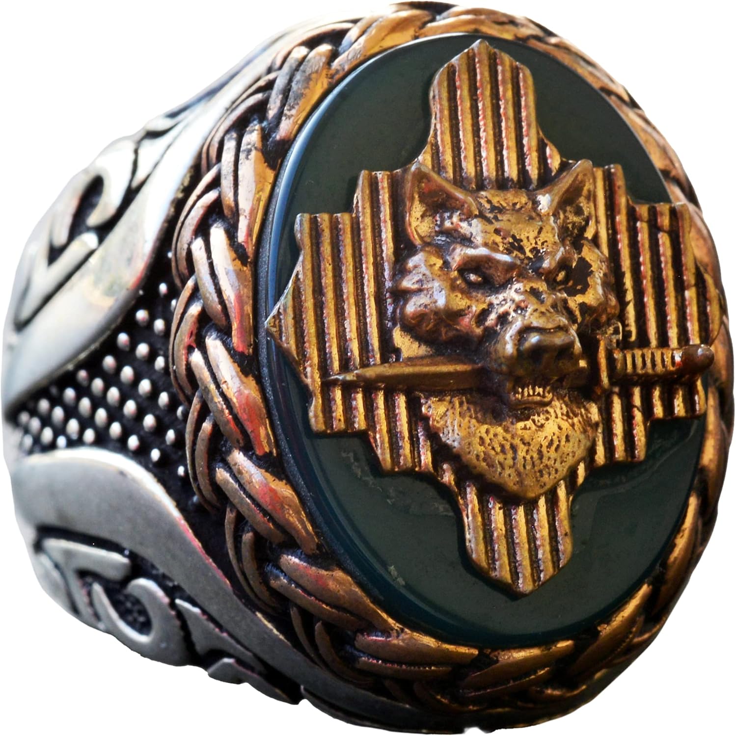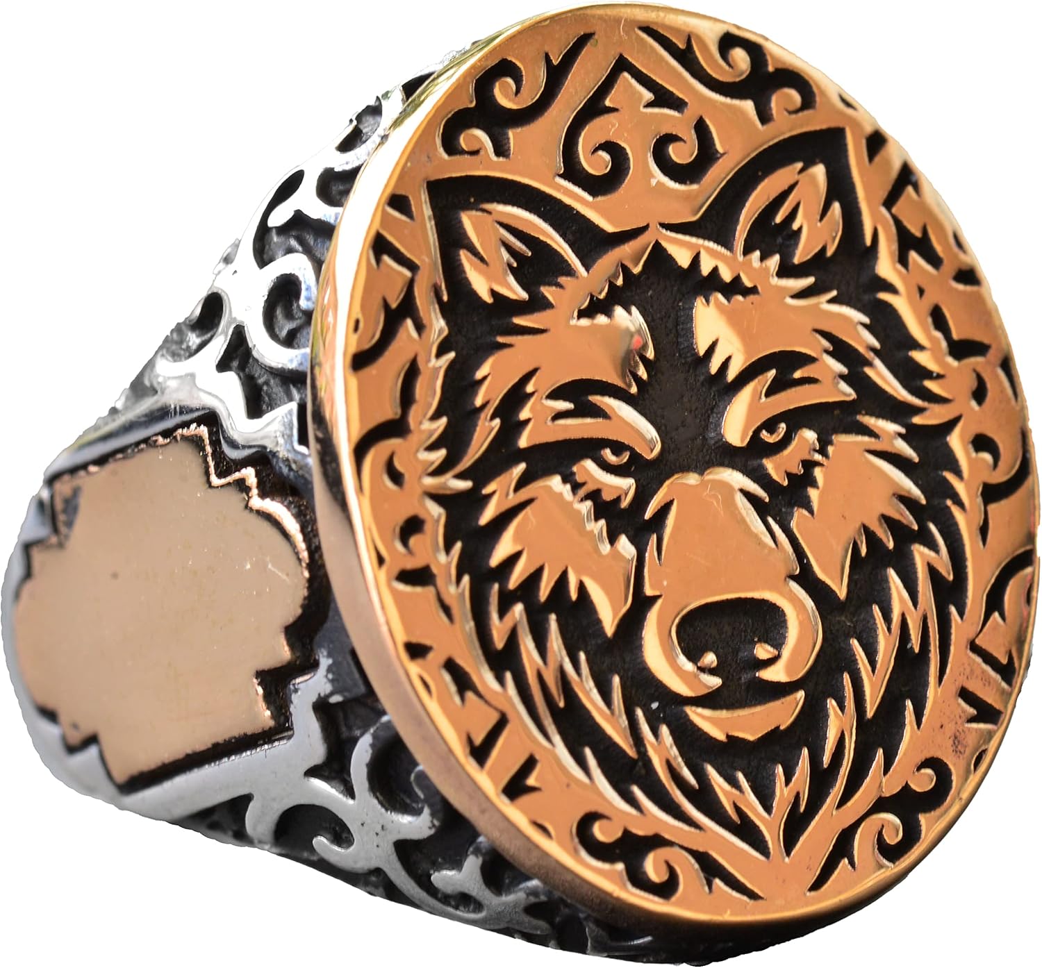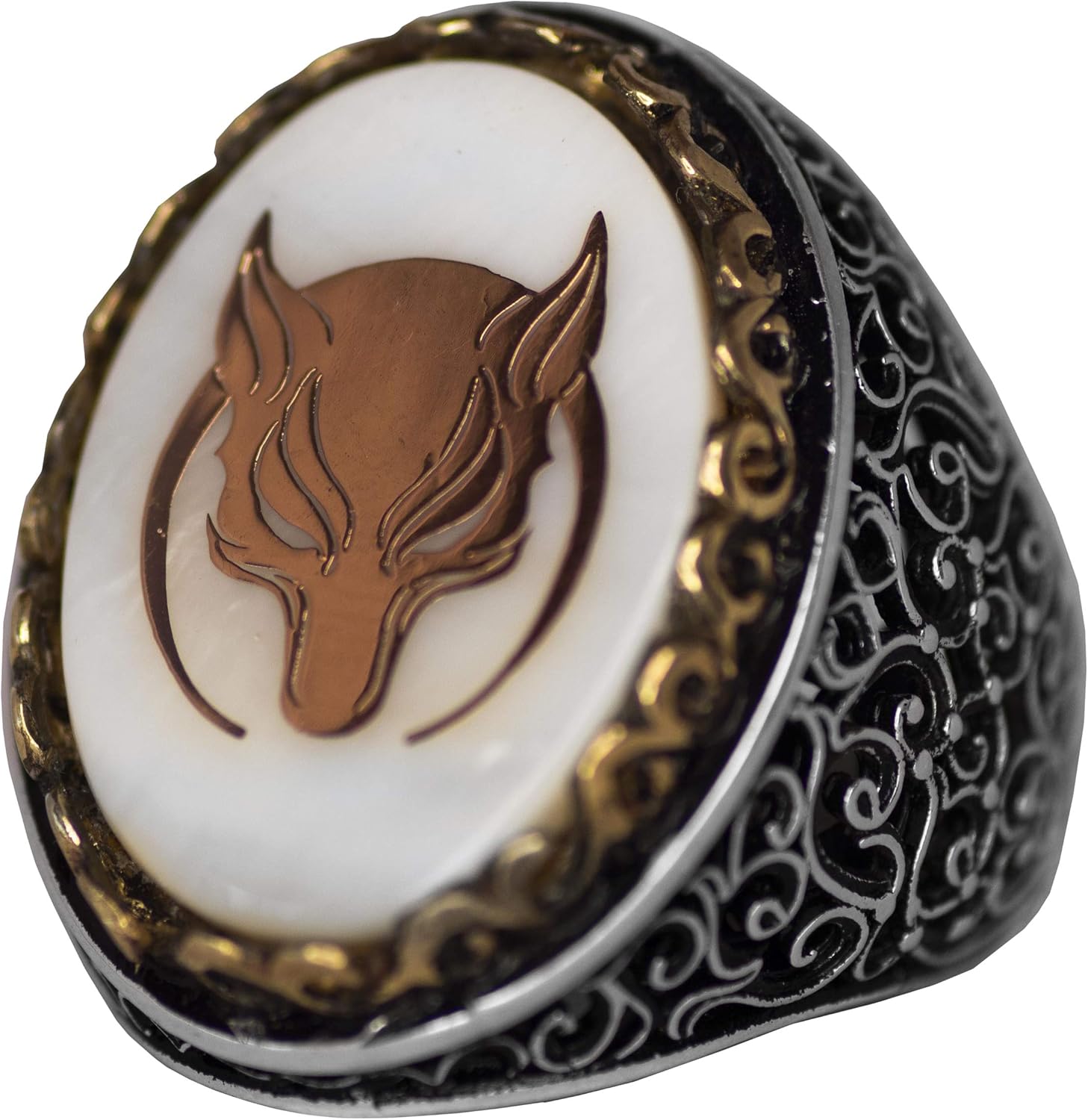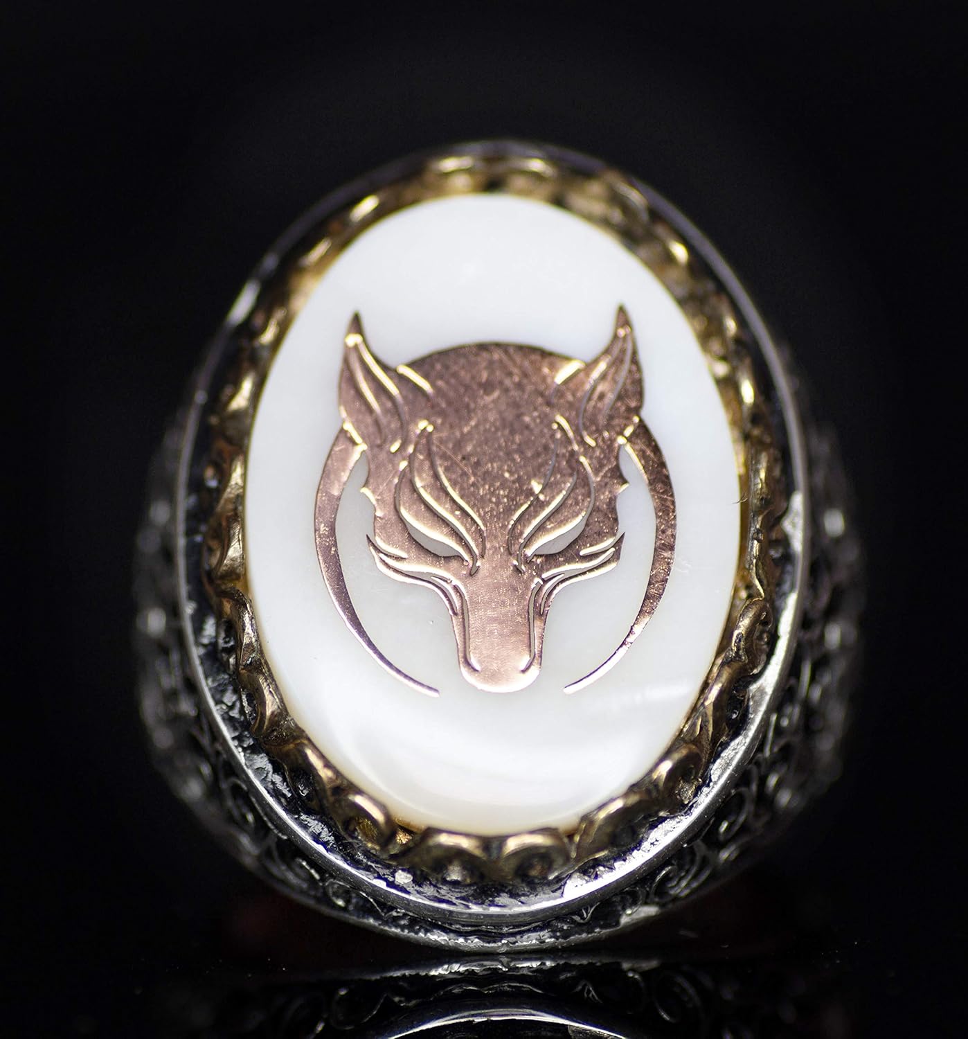 Kurt ve Hilal Erkek 925 Ayar Gümüş Yüzük - Kurt Sembolü ve Sedef Doğal Taşlarla Süslenmiş