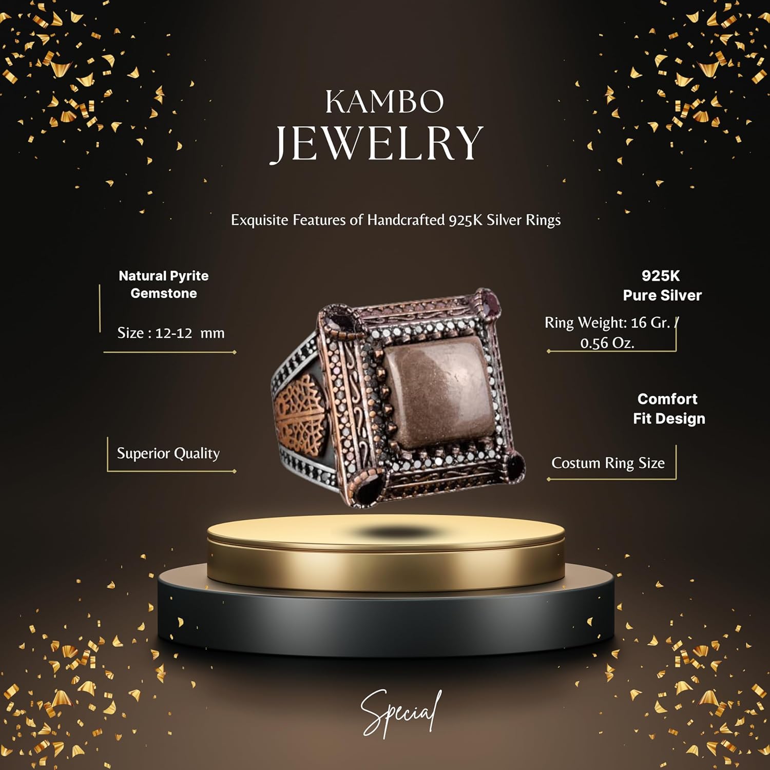 Sultan Yüzük, Gerçek Doğal Pirita Taşı Yüzük, 925 Ayar Gümüş Erkek Yüzük