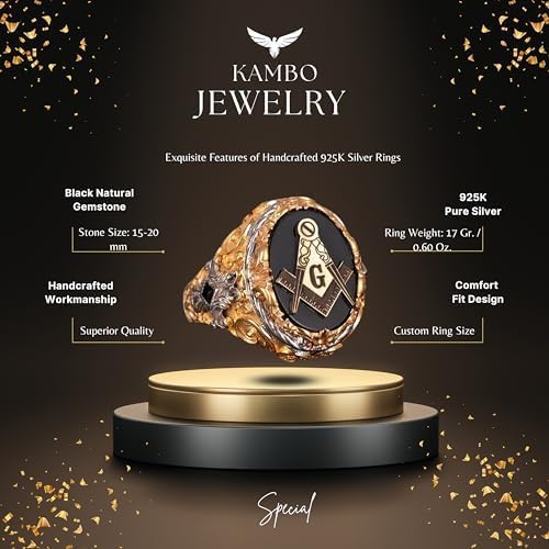 Usta Masonik Yüzük - 925 Ayar Gümüş, Altın Kaplama Siyah Obsidan, Mason Sembolü, Kelt Tasarımı Spiritüel Erkek Takısı (Özel)