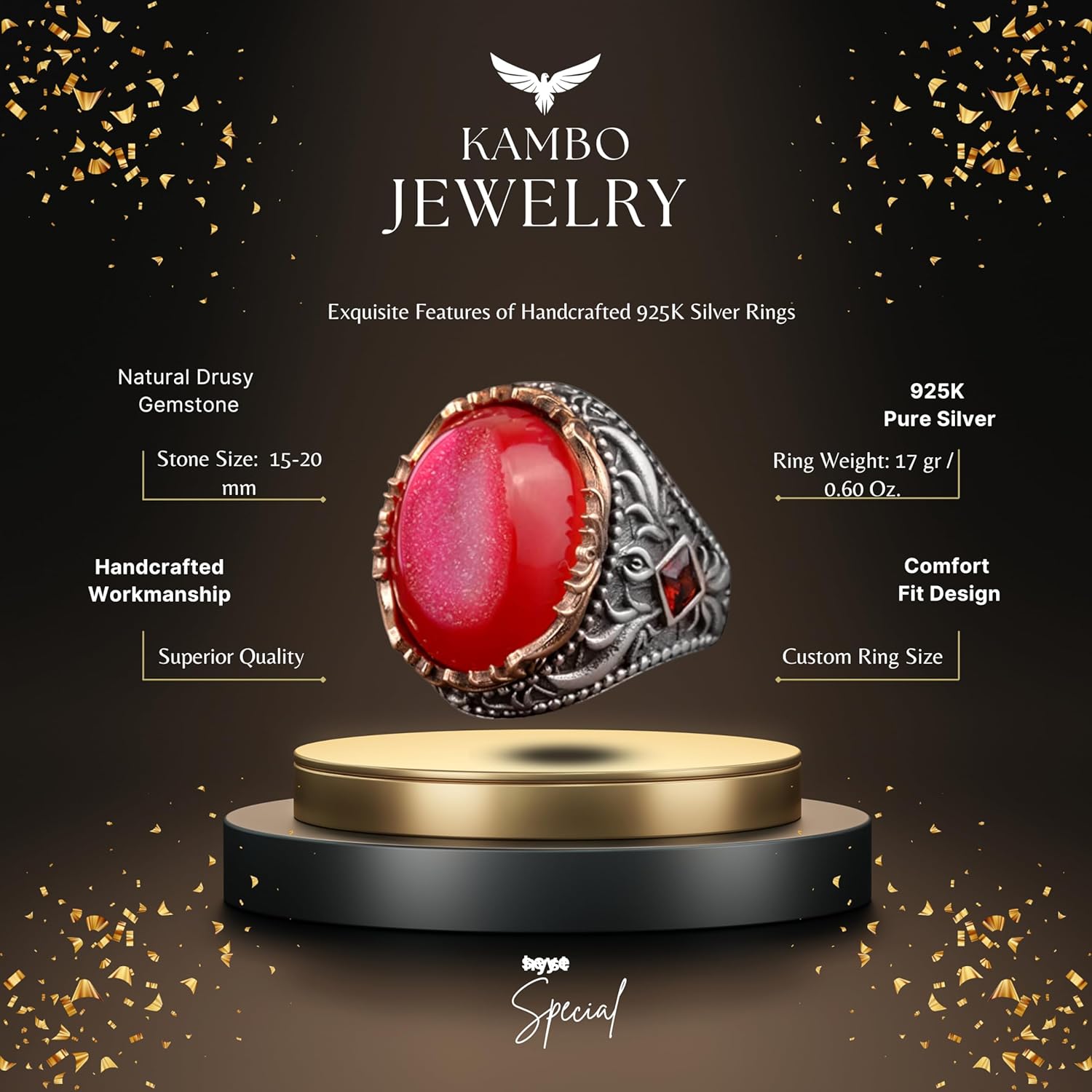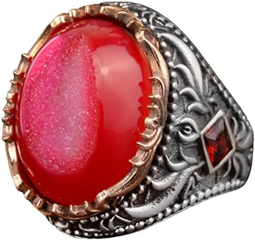 Vintage Erkek 925 Ayar Gümüş Yüzük Druzy Kuvars, Kırmızı