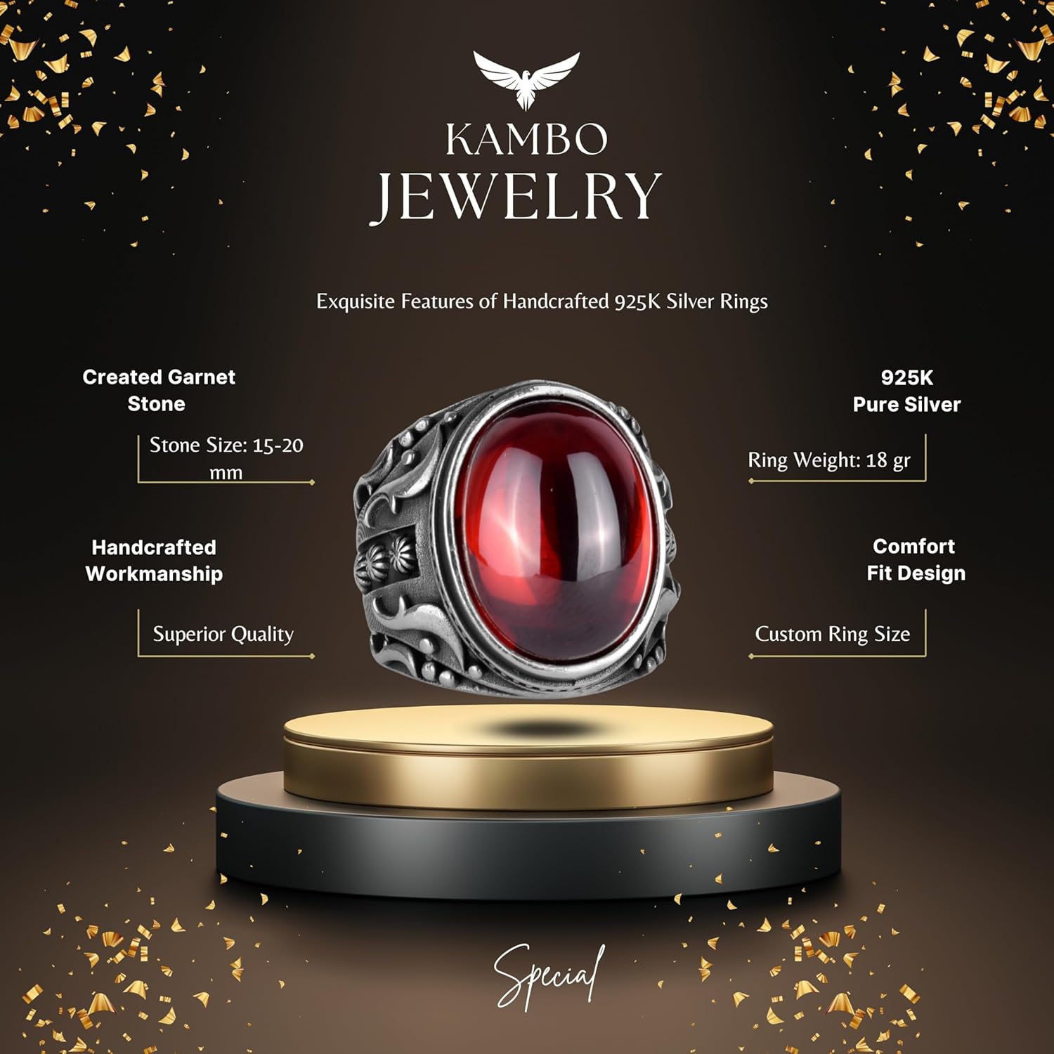 Üretilmiş Taş Yüzük, 925 Ayar Gümüş Yüzük, Tasarım Gümüş Erkek Yüzüğü (Cabochon Üretilmiş Granat Taşı)