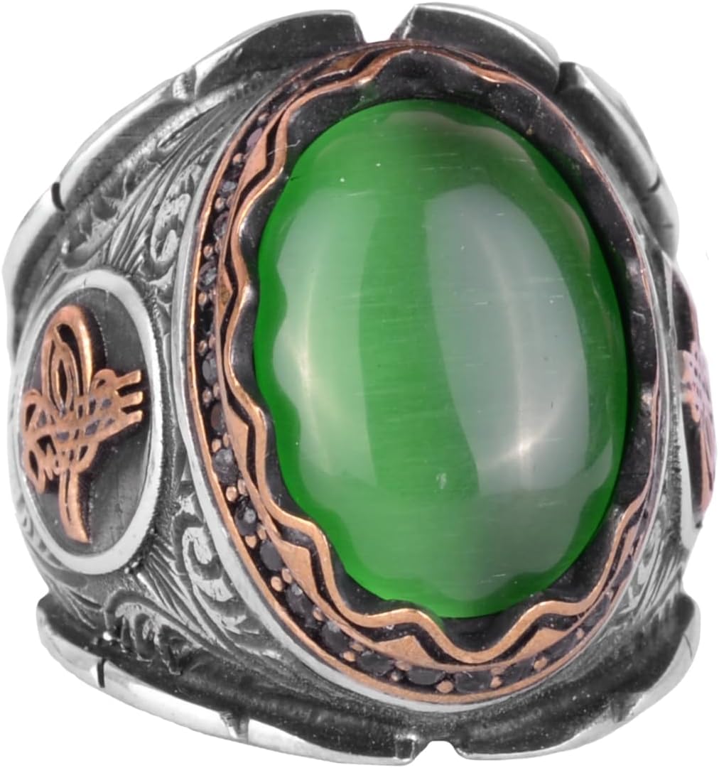Yeşil Catseye Yapay Taş Yüzük, Osmanlı Tugra Gümüş Yüzük, 925 Ayar Gümüş Yapay Taş Yüzükler - Çeşitli ve Farklı Koleksiyon