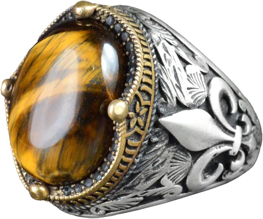 Zambak Desenli Gümüş Yüzük - 925 Ayar Gümüş El Yapımı Erkek Takısı (Kaplan Göz)