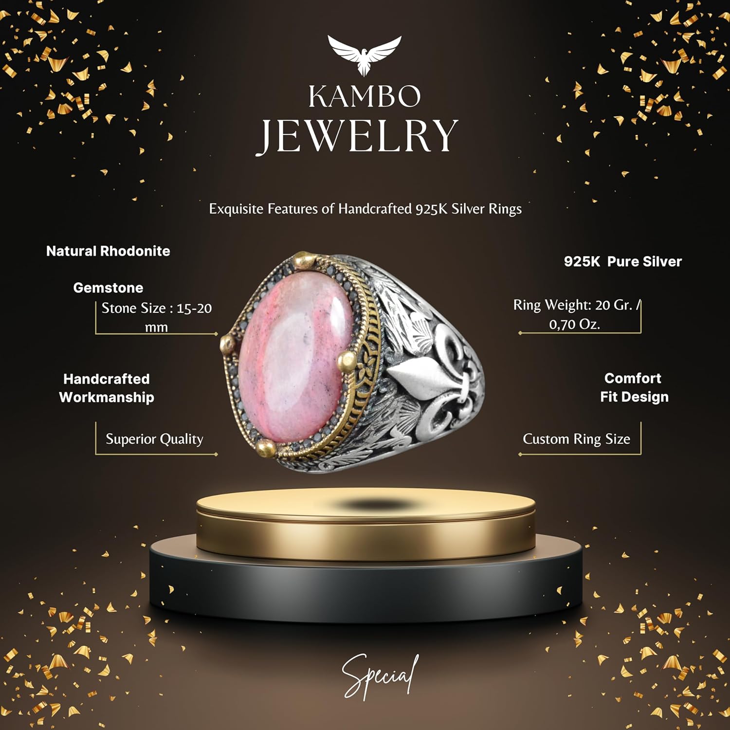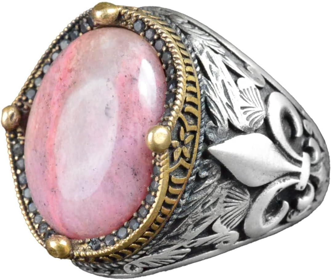 Zambak Desenli Gümüş Yüzük - 925 Ayar Gümüş El Yapımı Erkek Takısı (Rhodonit)
