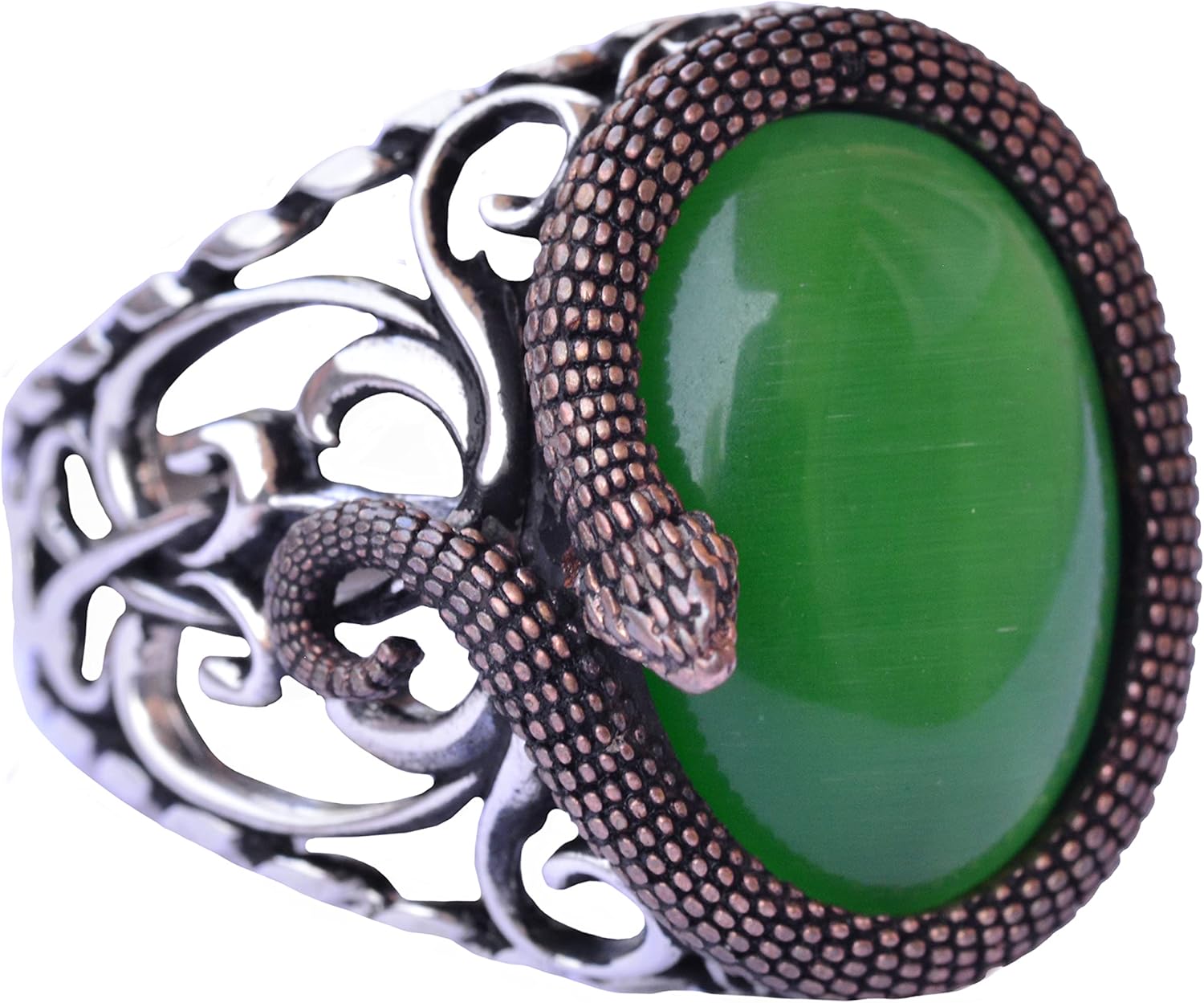 Zarif Yılan Süslemeli 925 Ayar Gümüş Erkek Taş Yüzük Koleksiyonu - Çeşitli ve Canlı (Jade Kedi Gözü Yapay Taş)