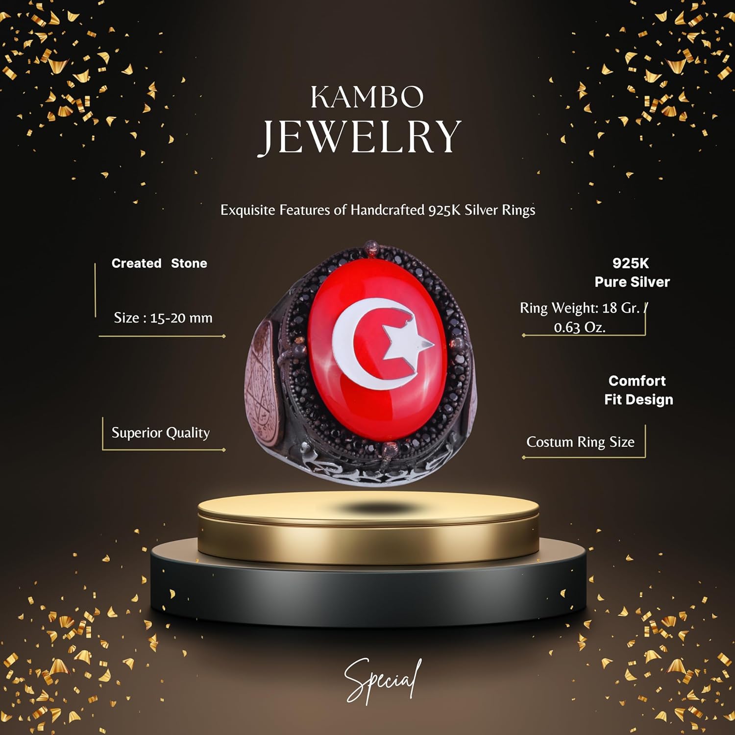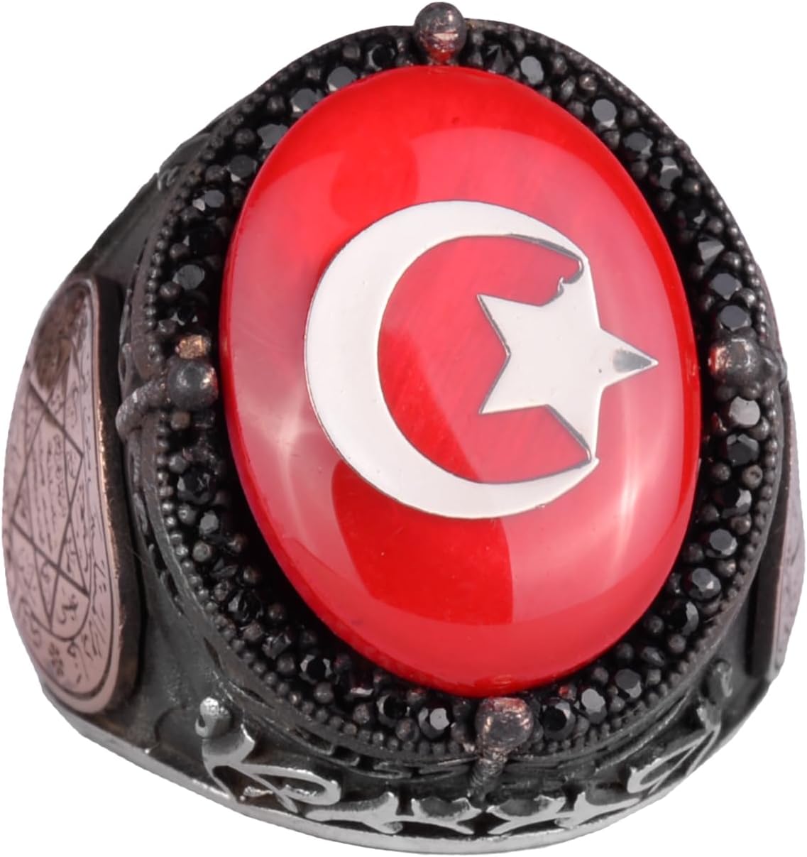 Yıldız ve Ay Yüzüğü - Erkekler için 925 Ayar Gümüş Bayrak Yüzüğü
