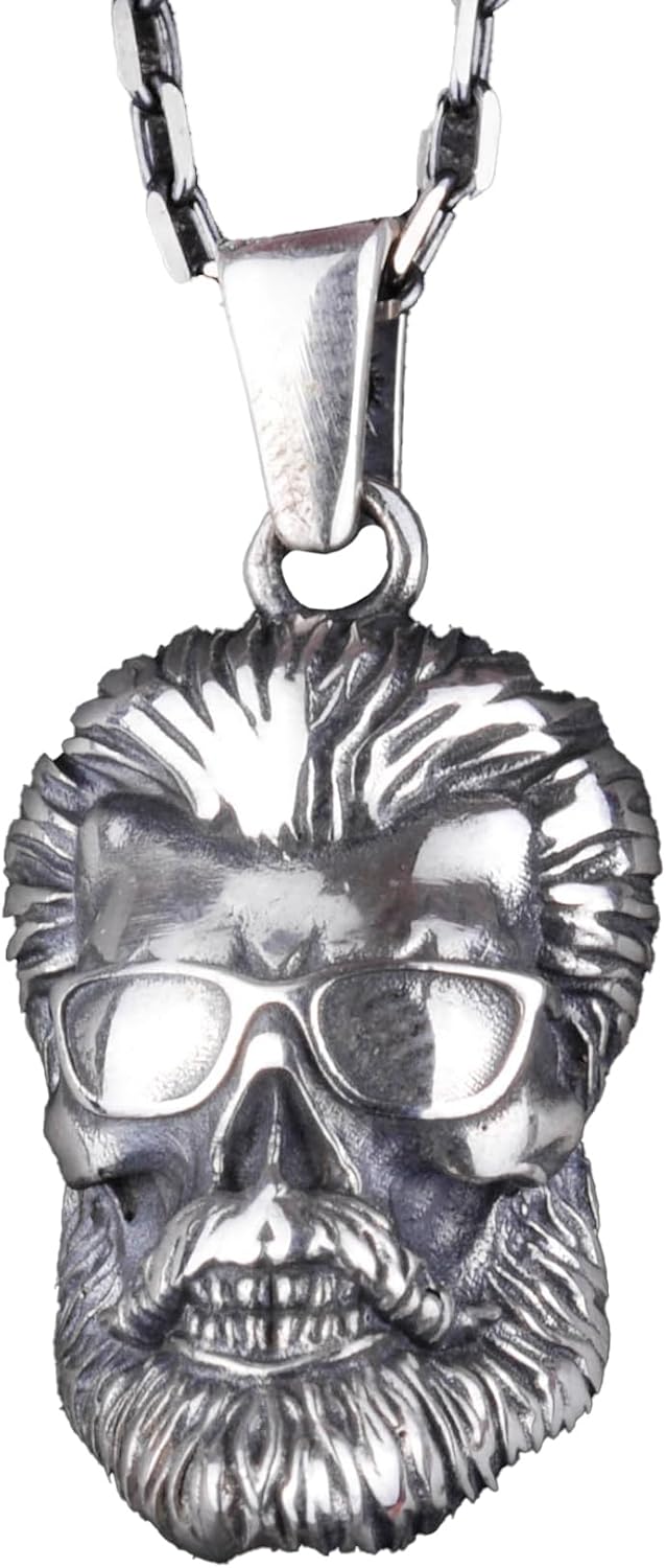 925 Ayar Gümüş Sakallı Kafatası Kolye, Gözlük Takmış El Yapımı Kafatası Pendenti, Cesur Erkek Takısı