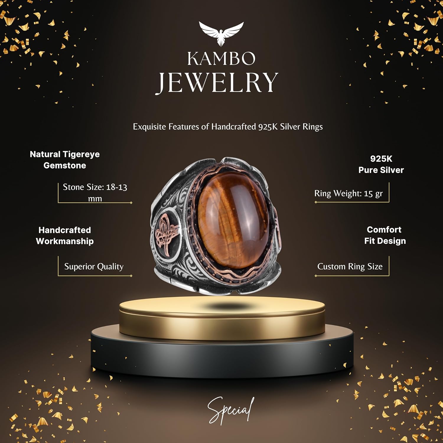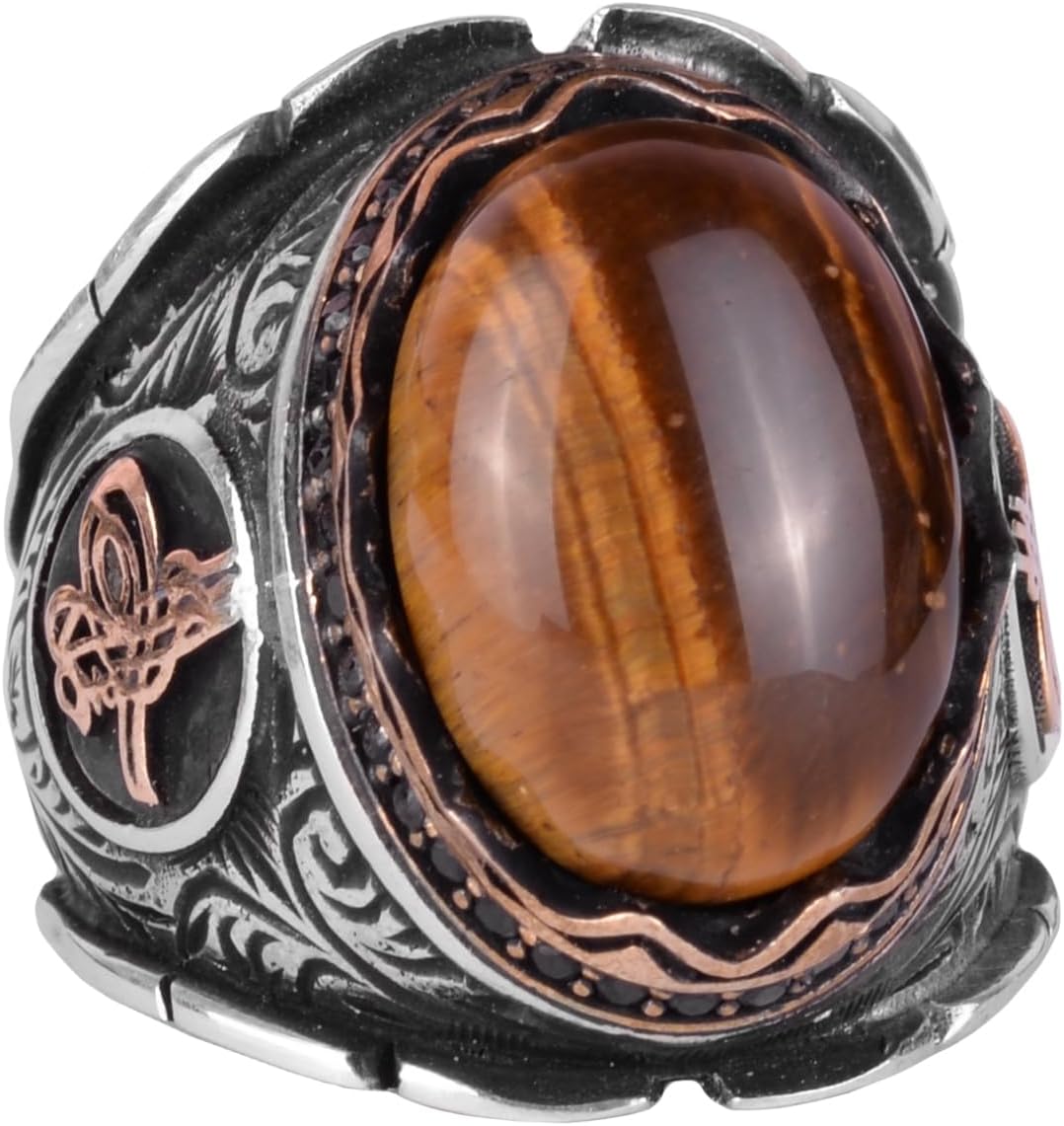 El Yapımı Cabochon Kaplan Gözlü Taş Yüzük, 925K Katı Gümüş Erkek Yüzüğü, Cesur Tasarım, Osmanlı Tuğra Yüzüğü