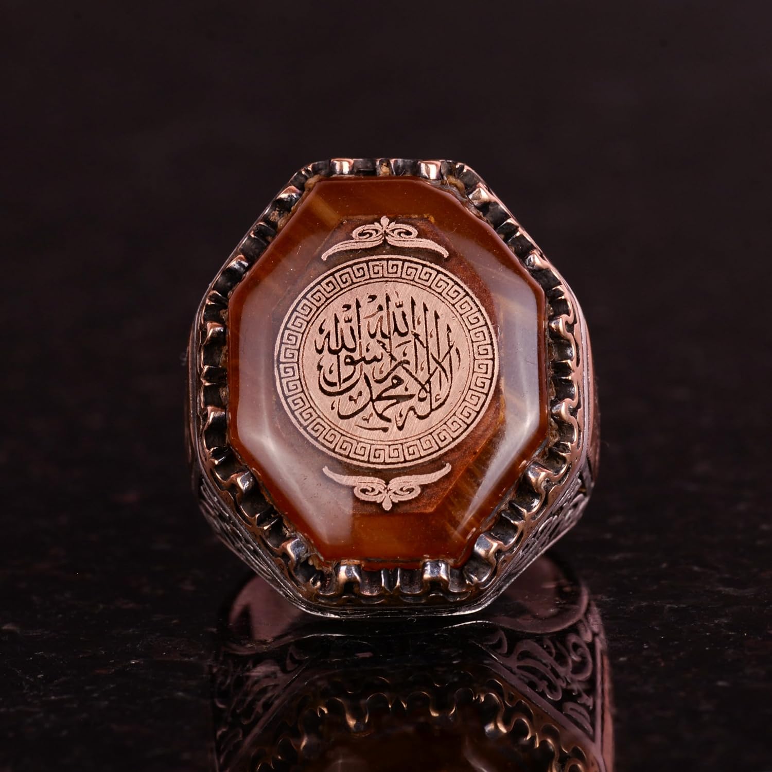 Erkekler için 925 Ayar Gümüş Yüzük, Amber Taşı, İslami Kelime-i Tevhid Yüzük, Müslüman Hediyesi, Dini Yüzük
