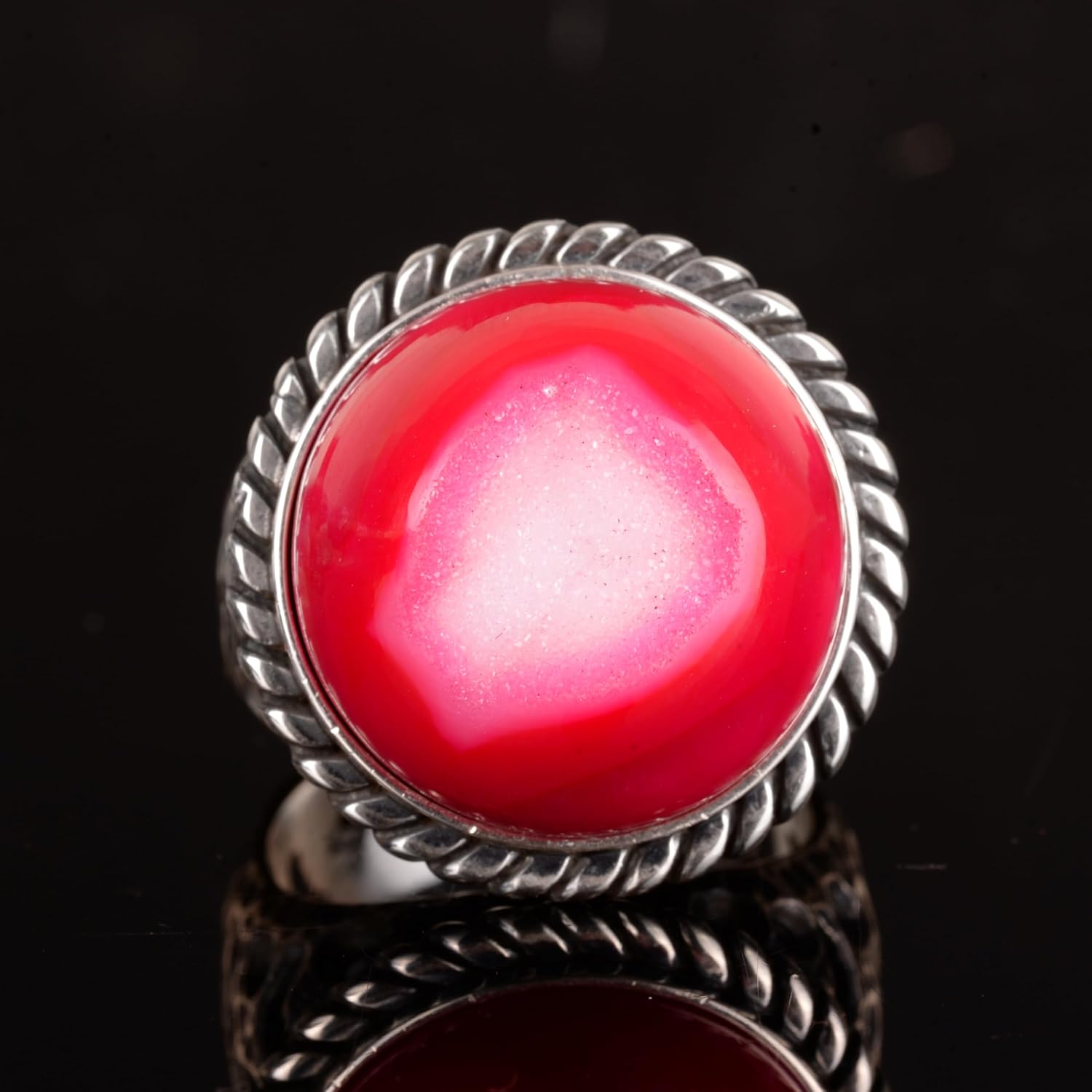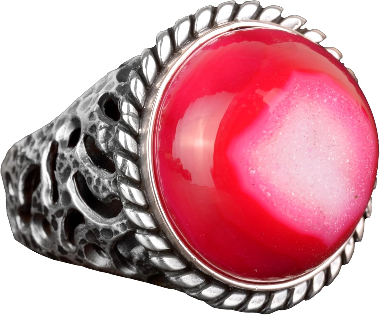 Erkekler için 925 Ayar Gümüş Yüzük, Doğal Druzy Kuvars: Mavi, Yeşil, Kırmızı Varyasyonlar (Kırmızı)