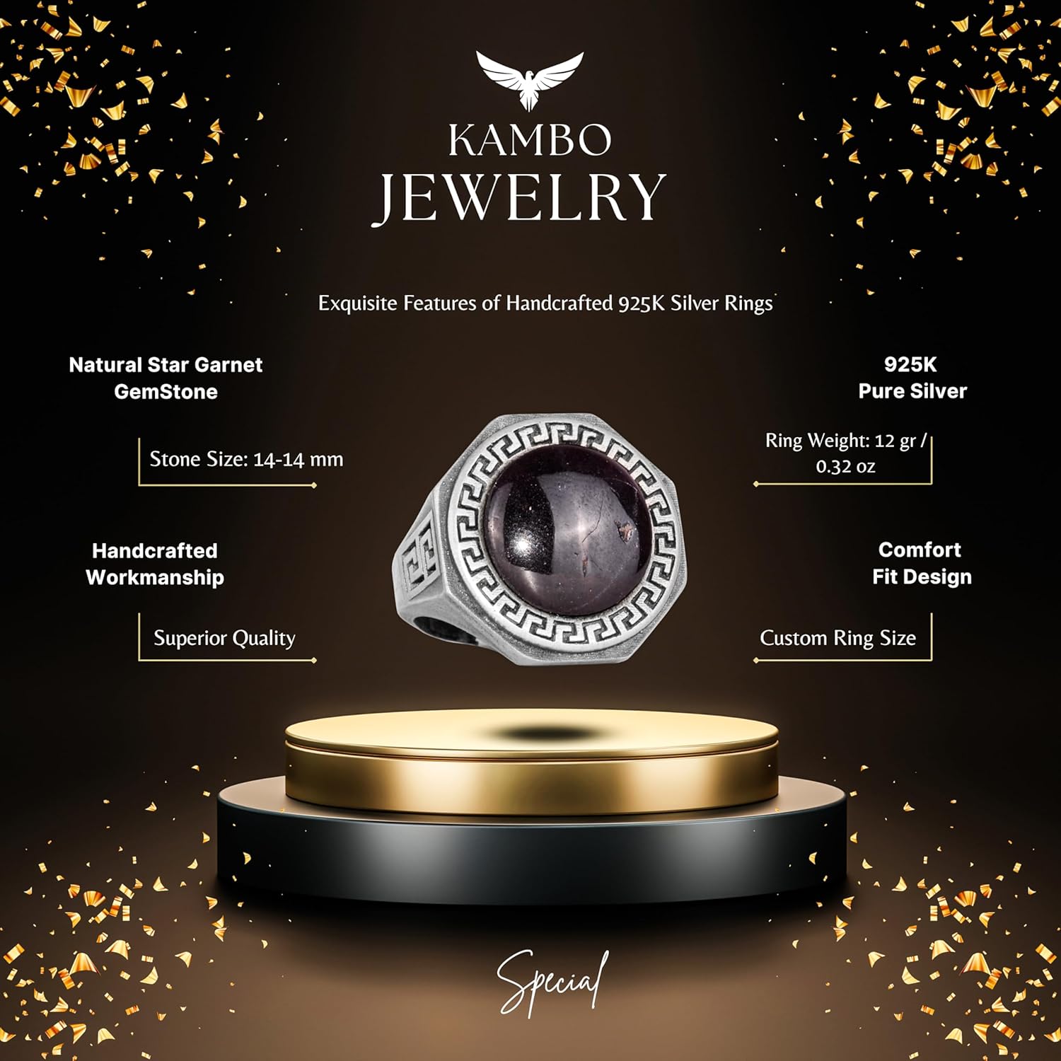 Erkekler için 925 Ayar Gümüş Yüzük, Doğal Yıldız Garnet Taşı - Yunan Desen Tasarımı