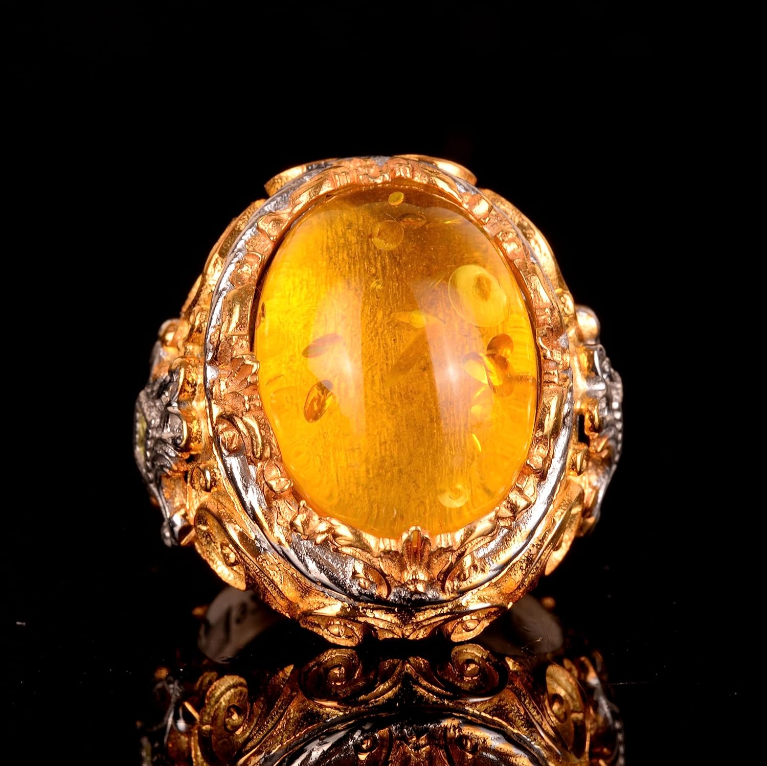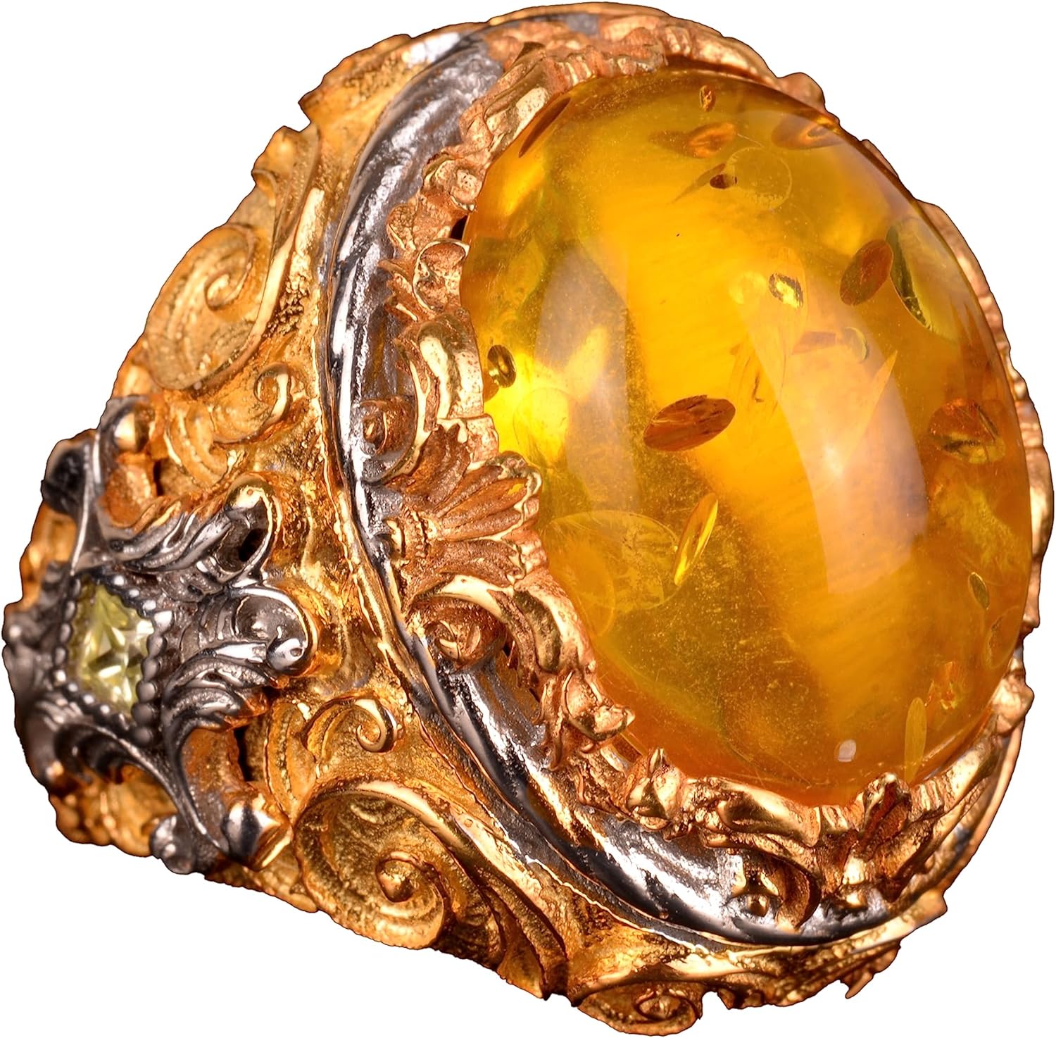 Erkekler için 925 Ayar Gümüş Yüzük, Doğal Olmayan Bal Amber Taşı ile